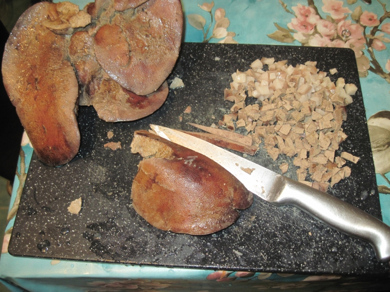 За целта е необходима една свинска глава, бял, черен дроб. Може също да се използват сърца, далак, бъбреци. Аз имах само дроб.