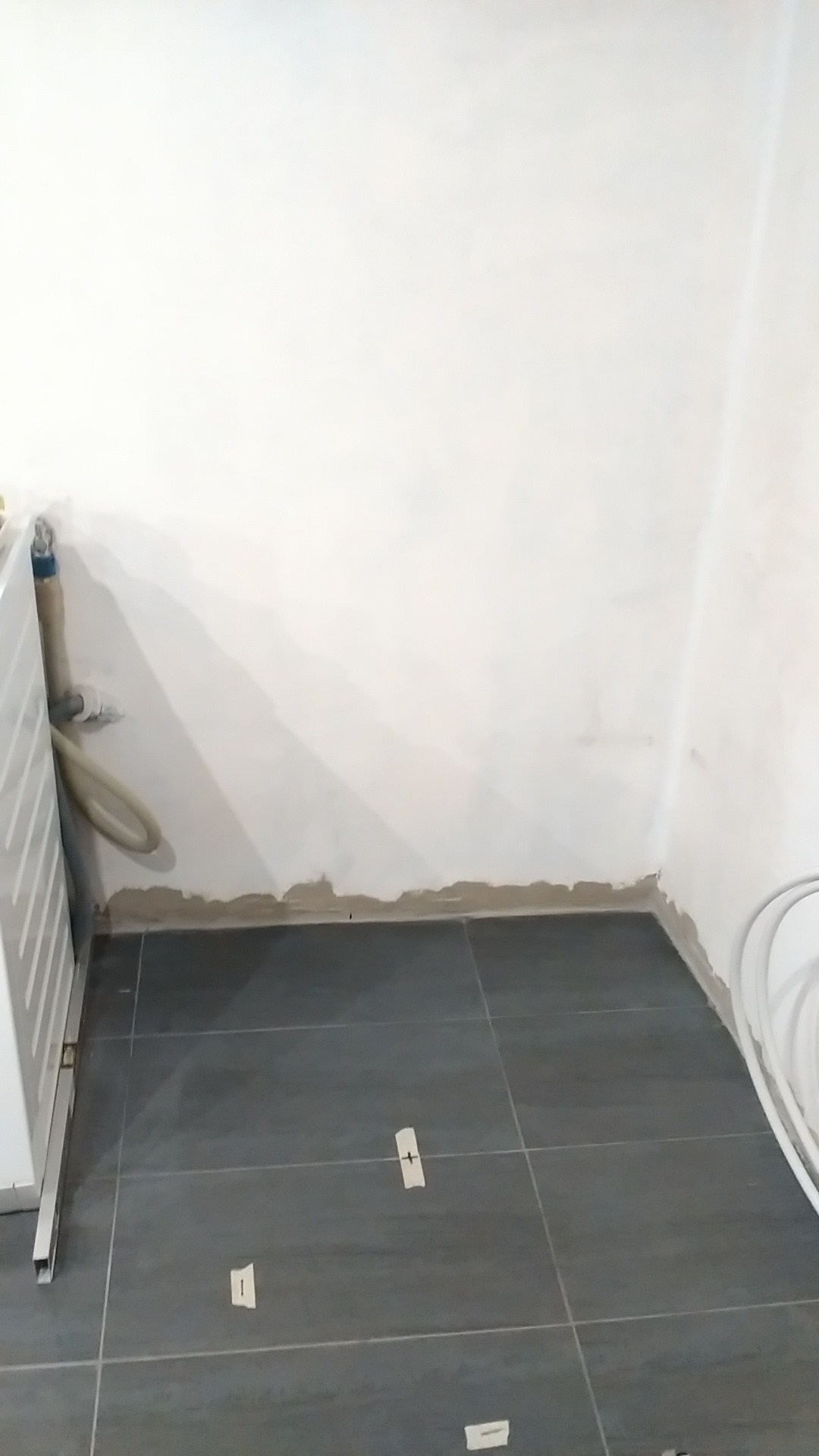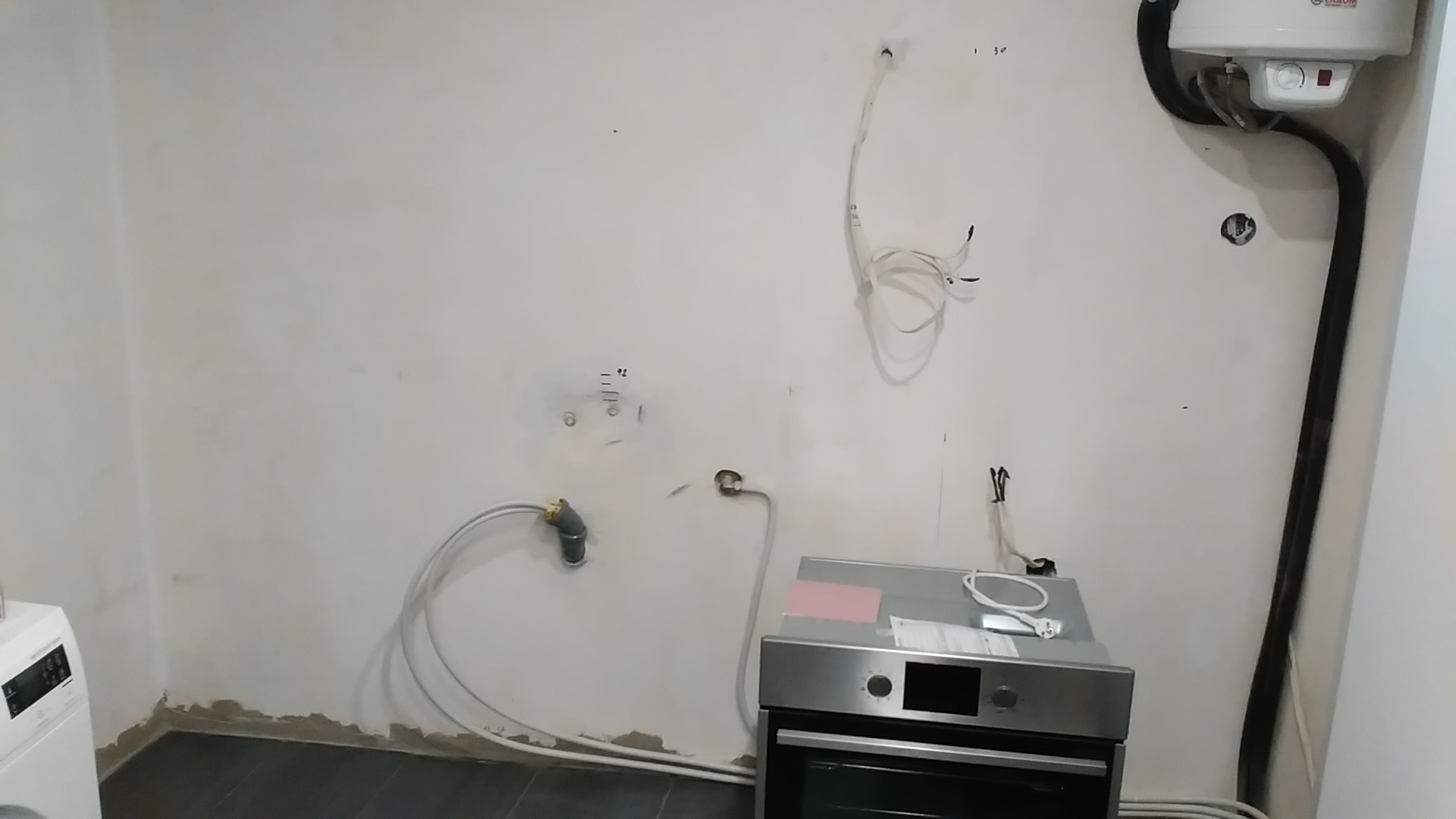 Имаше вариант да се изправи кривата стена (с гипсокартон), там където е бойлерът но вече е късно. Сега Г-то или L -кухнятя по модерному, ще трябва да е с тъп ъгъл. Въпросът е, как ъгловият шкаф да следва двете стени, като едновременно да е с двойна вратичка... Ще го мисля още.