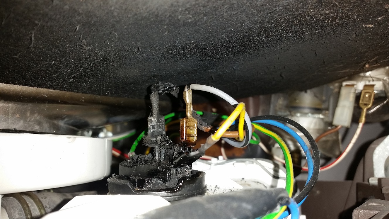 Зачистих кабелните обувки, оправих кафевия кабел и ги свързах както бяха на стария. Първо идва фаза на зеления (по-тънък) и водата се сгрява. Фазата на кафевия (по-дебел) ту се появява, ту изчезва. На другите 2 (жълтия и сивия) няма фаза. Миялната стои повече от 1 час на стъпката за миене и не преминава на следващата стъпка, върти си помпата, нагревателя си грее, водата не прегрява. Предполагам, че не стига сигнал, че водата е загряла.