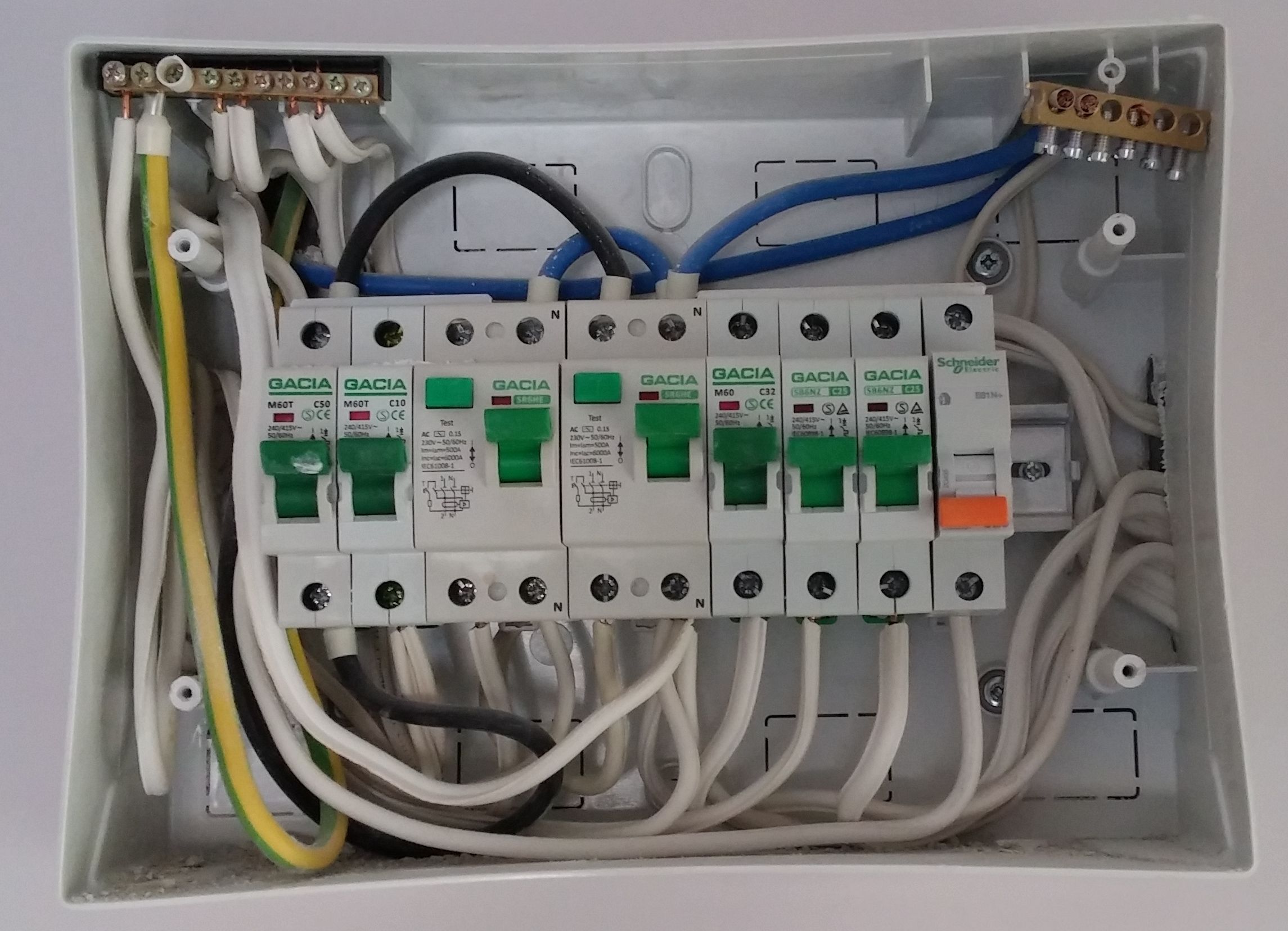 Здравейте - таблото на снимката е монтирано от строителя, предпазителите са китайски, а няколко човека вече ми казаха, виждайки го на снимка, че според тях трябва да се преправи (без да навлизаме в подробности защо, но реакциите бяха по-скоро от типа "Ооууу"). Кръговете ме устройват, имаше едно жужене, което с понатягане на съответния предпазител изчезна и като цяло не е имало проблеми, нито съм чул съседи да се оплакват. Аз се водя по максимата - ако не е счупено, не го оправяй, но все пак говорим за ток - на него веднъж му е нужно мен да ме оправи :-D :-D :-D Пък и ми пуснаха мухата вече... Тъй като моите способности ми стигат да вържа ключ и контакт, но не и печка, например... то въпросът ми е към по-вещите в занаята - дали виждате нещо притеснително, освен феноменталната марка GACIA?