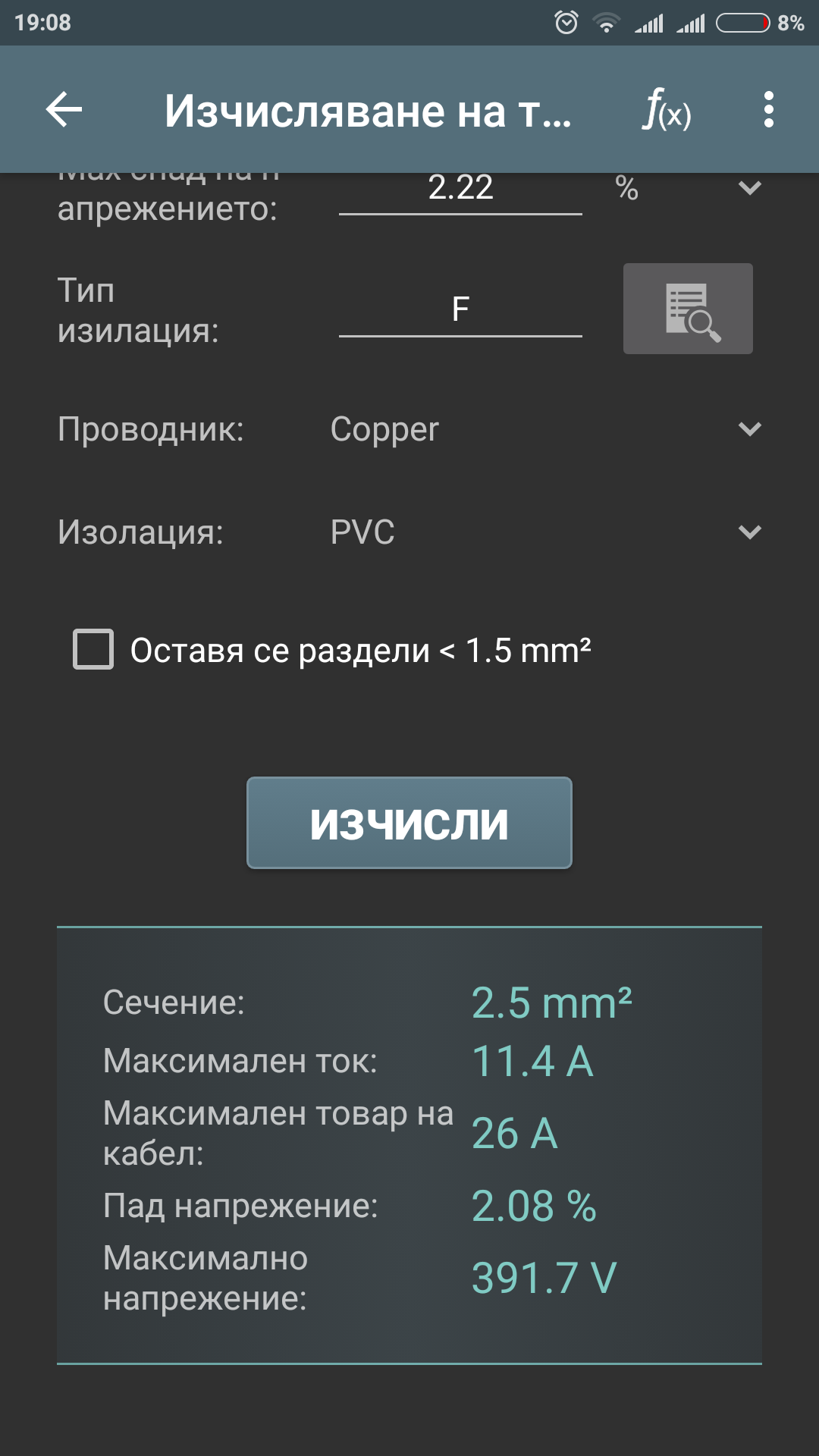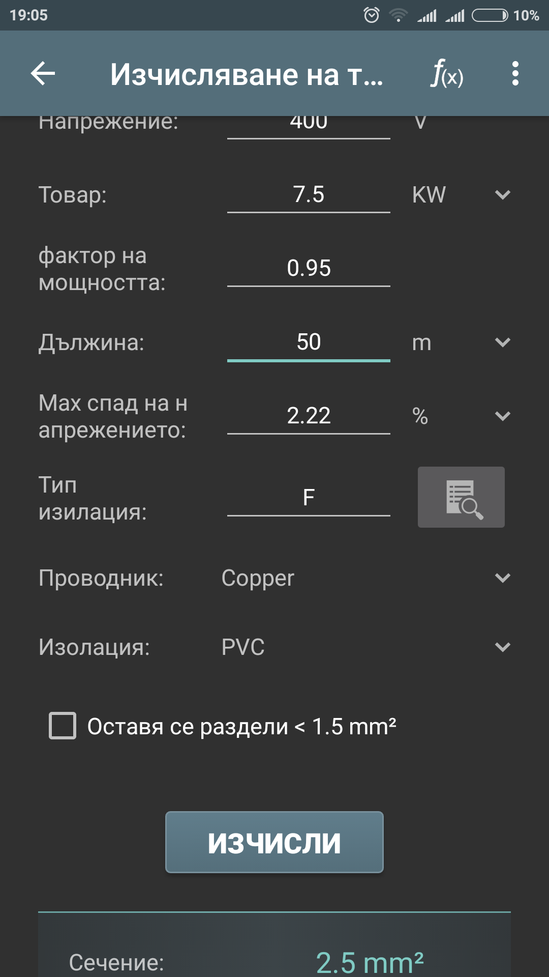 пада на напрежение се смята с ей тези формули и според тях 2.5мм* е достатъчно