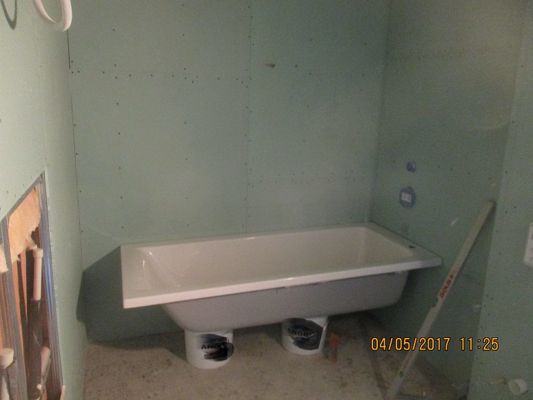 Пода е с водно подово отопление и там ще е санитарен силикон на снадката под-стена, даже заради това на пода профили са лепени с ПУ, стената отляво още чака вградени смесители...