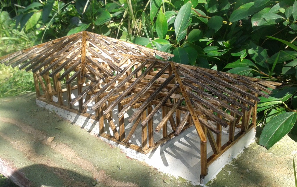 И още нещо да ви пусна за днес.Това е макет на паянтовата дървена конструкцея на проекта ми.Като цяло е копие на стария съборен хамбар.Целта ми ще е да го изпълня максимално точно и реалестично.Желание и хъс имам за сега само времето ми е ограничено .Покрива смятам да покрия със стари турски керемиди а стените от вън със шиндли/ клиновидно дялани букови дъски /-както е строено някога в Елена.