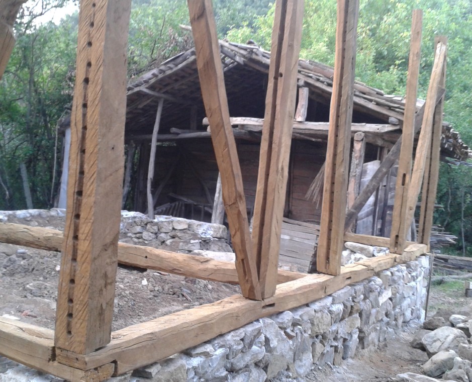 Великия ми строеж започва лека -полека..А сега малко относно моя проект.Като цяло мисля да използувам старите основи като само ги повазстановя.Новия строеж ще бъде почти идентичен с това което премахнах.Имам намеренее да го изградя със стария дървен материал които е много запазен като Паянтова дървена конструкция.При повечето снадки ще използвам дървени дюбели .Дървото е много твърдо и не е възможно да се пробива с дрелка затова със стария маткап.Трудоемко е но става.Гредите са от 13х13 до 15х15 .Понеже са в конструкцията и някога ще бъдат скрити ги мажа с креолит-идеално импрегнира срещу мокрене и влага.Както се вижда от скицата ми по- горе ,бъдещата къща няма да е много голяма ще има две помещения.Една по-голяма стая в която ще се влиза от по-малка, интегрираща в себе си входно антре, малка кухня и баня с тоалетна.Пред нея ще има само покрита площ която ще служи като наземна тераса с голяма маса и барбекю.Като понапредна ще пусна още снимки за коментари.