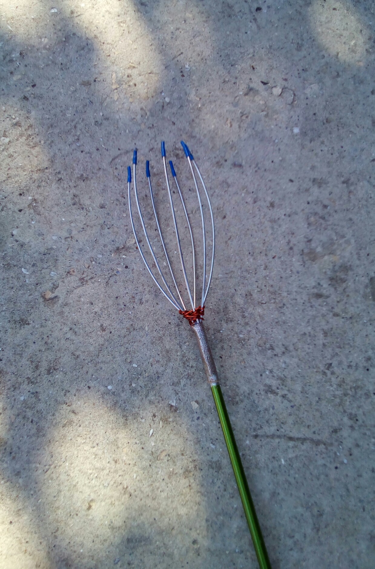 Водачите и върха са излишни и се махат. От поцинкованата тел се режат няколко парчета ( колкото могат да влязат в горния отвор на телескопа) дълги около 20 см. Огъват се в чашковидна форма като в долния край се оставя 3-4 см. права част която влиза в телескопа. За да не се въртят ги увивам с медната тел и дебел конец който съм лакирал за да не се къса и развива. Връхчетата на телта ги обувам с мека кабелна изолация за да не нараняват плодовете.