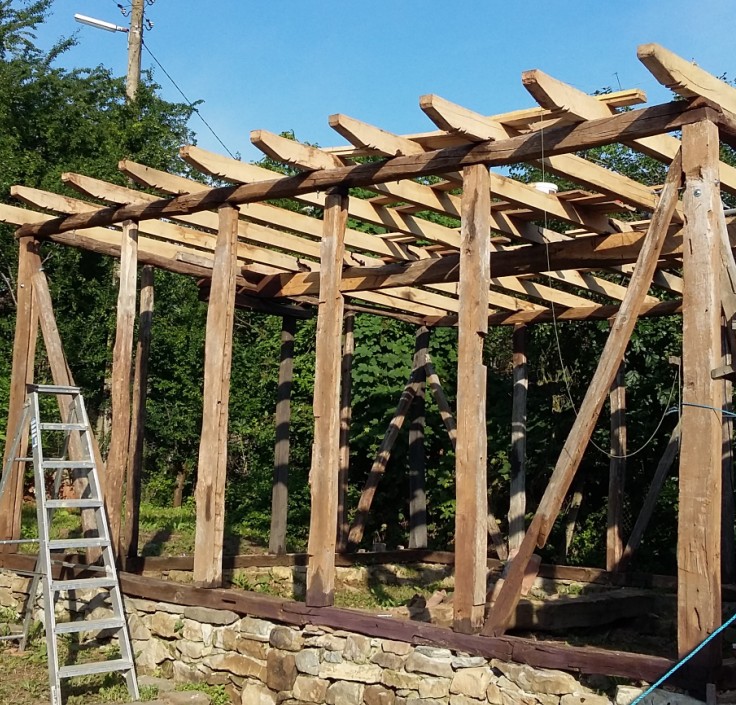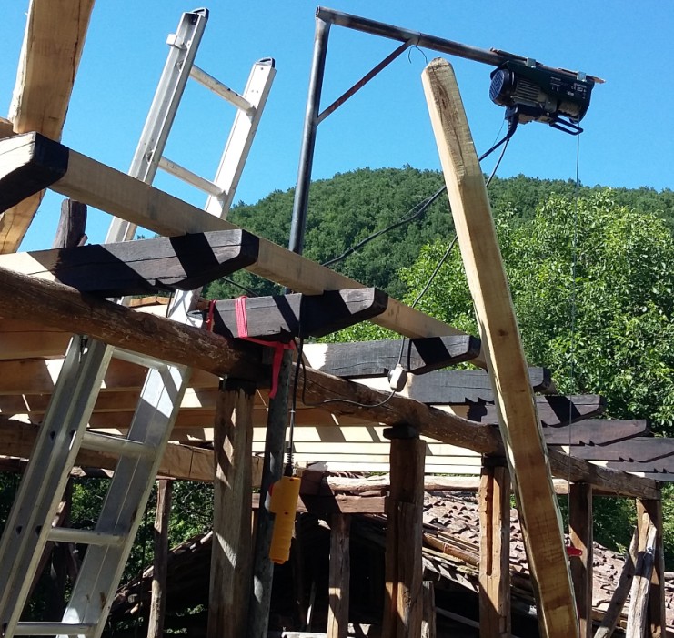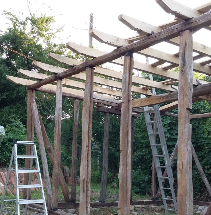 Така бях приключил миналата година и сега започнах с гредите на тавана.Те са дъбови и са работени зимата.При съхненето са се получили малки пукнатини но мисля че не е фатално.