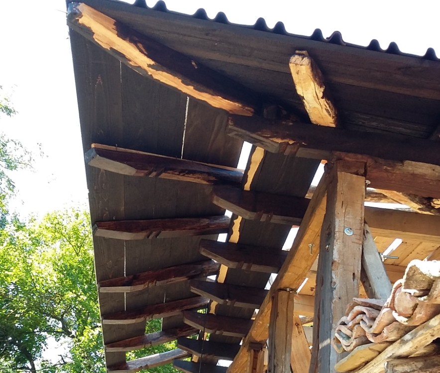 Продължавам напред с обшивката на покрива.Дъските които продават са много мокри и бързам да ги накова и затисна с керемидите защото от топлото време изсъхват бързо и започват да се кривят. Преди коването ги мажа с отработено масло разредено с малко нафта и после 50 на 50 слагам креолит защото отива много материал.След като накова страна от покрива го намазвам и от горе.Много пипкава работа.Готовата страна покривам с руфолина които поставям под керемиките за да съхнат дъските по умерено.