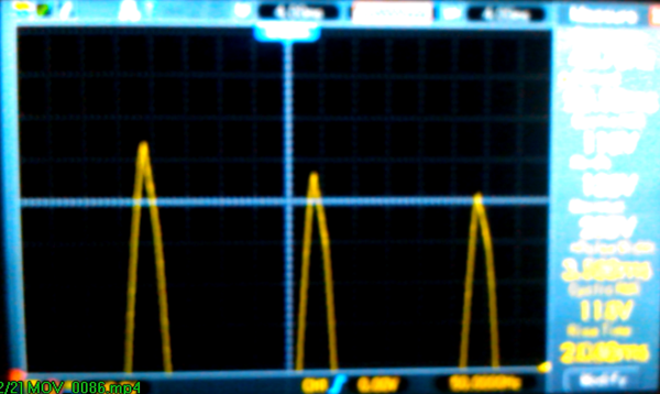 Е, "кучето" въпреки моите притеснения - оцеля. А пък ако трябва да добавя и тази осцилограма на напрежението на моменти там, нещата стават още по-зле. От време на време с продължителност около половин час, всички ЛНЖ в къщите по цялата улица мигаха с честота приблизително(по мое усмотрение) около 10 херца. Ето даже снимка на осцилограмата: