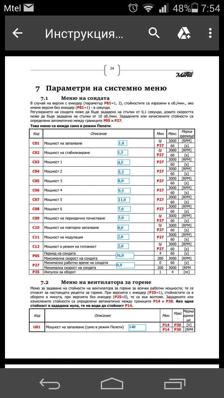 Въведох тези параметри, но е много зле така :cry: Запали и след малко загасна, после опитах в потребителското меню на Калибриране шнек е от 5 до -5, беше на 0, направих го на -2, запали, поработи малко, вдигна 42 градуса и почна да пада температурата, а иначе ми направи впечатление, че за около час ВСИЧКО БЕШЕ ИЗГОРЯЛО и нямаше даже пепел /това досега не се е случвало, винаги и при малко работа е имало шлака/. Дали да не опитам да ги направя на малко повече секунди тези параметри от СО3 до СО7??