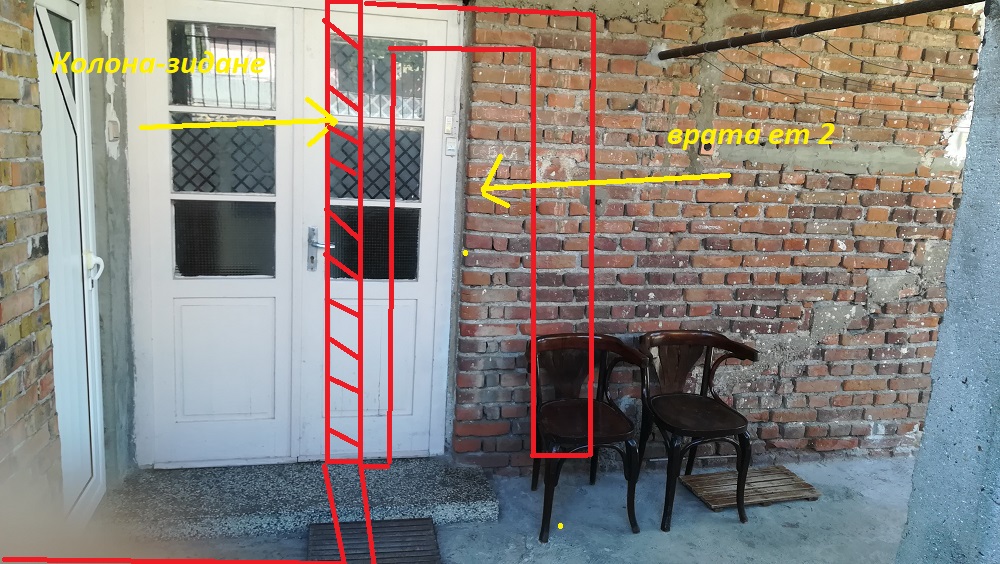 Това е ....... не обърнах внимание на чертежа че двете врати са една до друга..... от ляво няма да има нищо , вратата за първия етаж ще е на новата стена която ще зида от вън..... не съм голям художник но дано разберете драсканиците ми.
