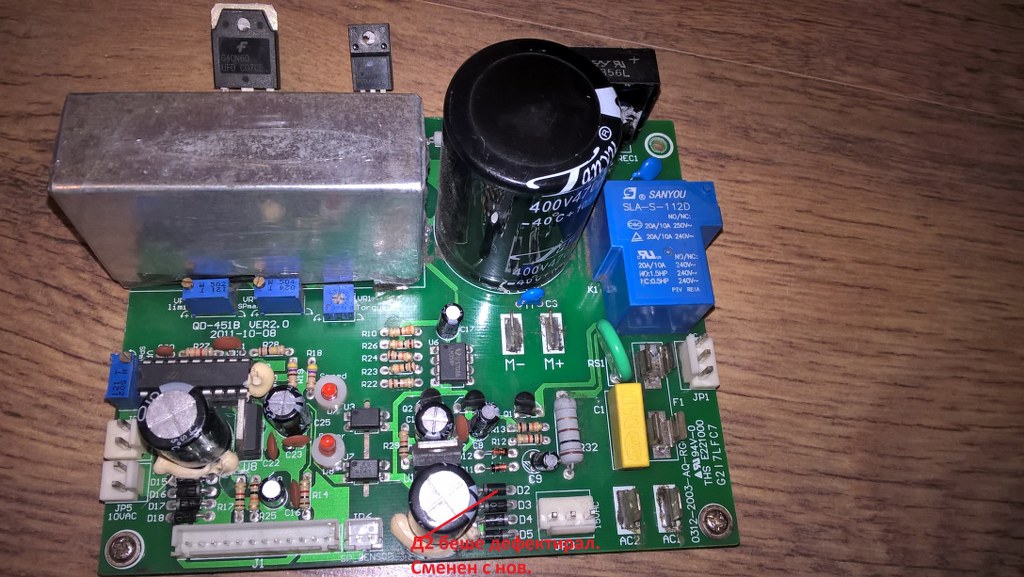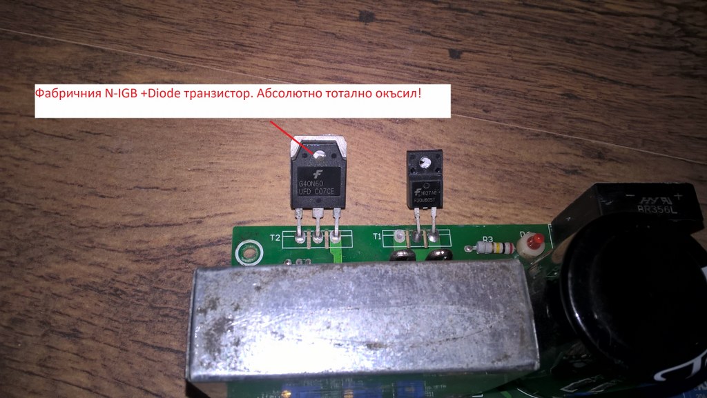 На главната платка беше изгърмял предпазния бушон, мощния N-IGB+D транзистор беше тотално окъсил, точно пред него има прегрял резистор с неясни фабрични параметри ( в момента показва 330 ома), имаше изгорял диод D2 4007.