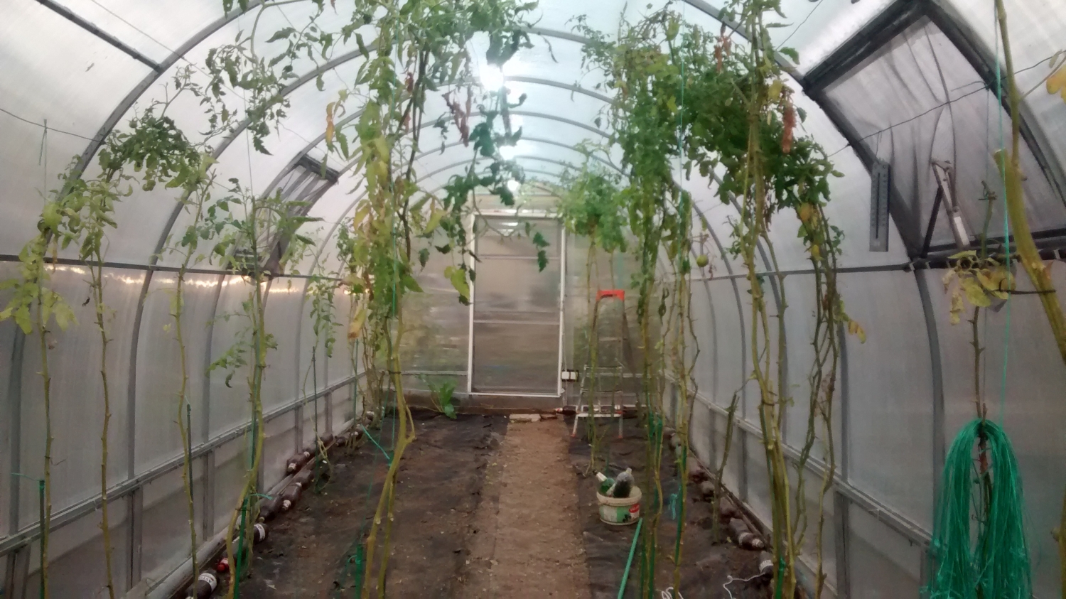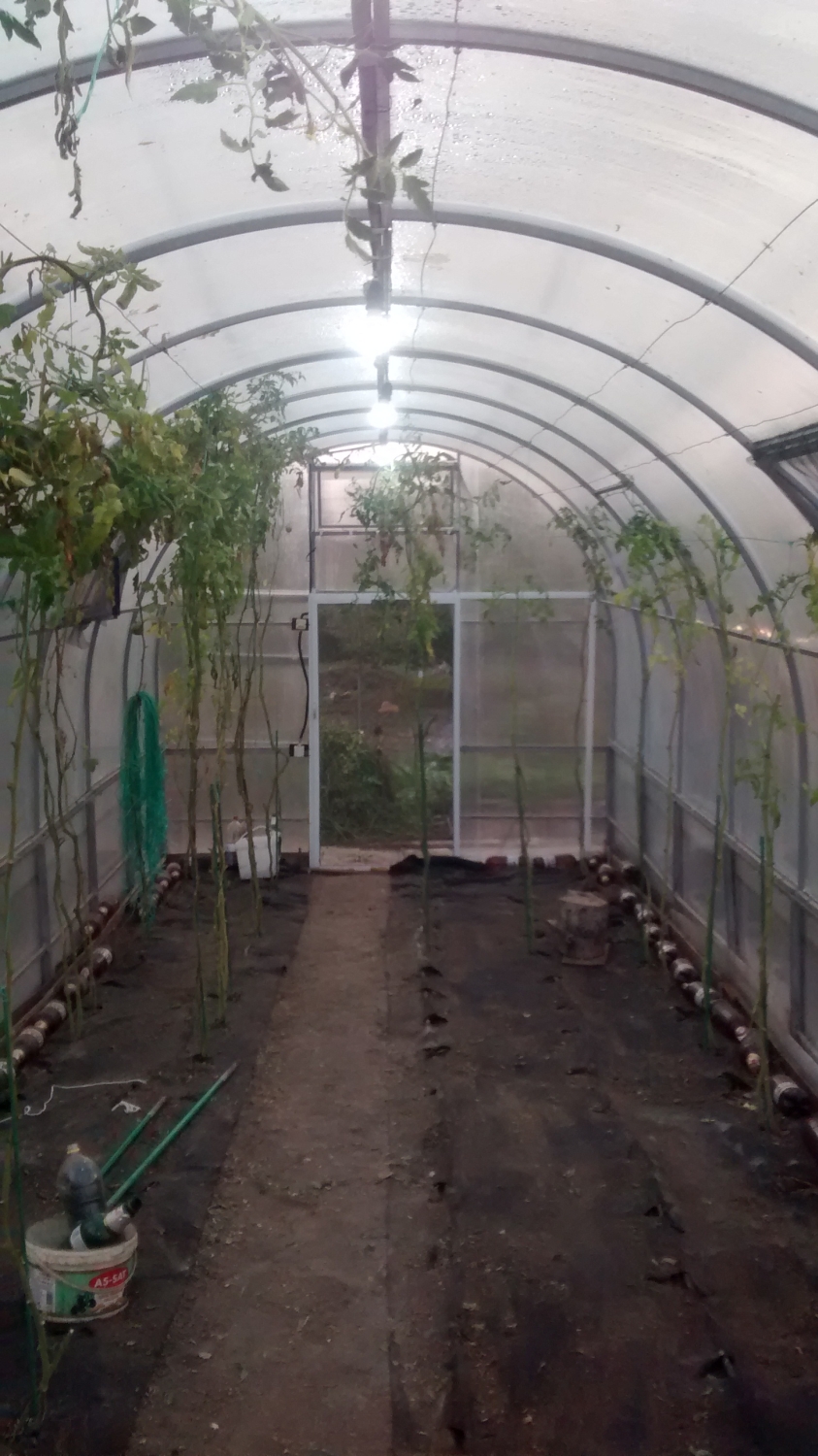 снимки на проскубания домат в оранжерията..Като оскубя останалия - миене на поликарбона с р-р с белина и опъскване Тр. да махна и геотекстила и да опръскам със син камъ почвата .След 2 седмици окопаване и садене. Миналата година палих серни димки - тази година няма да го правя ,че е отврат.