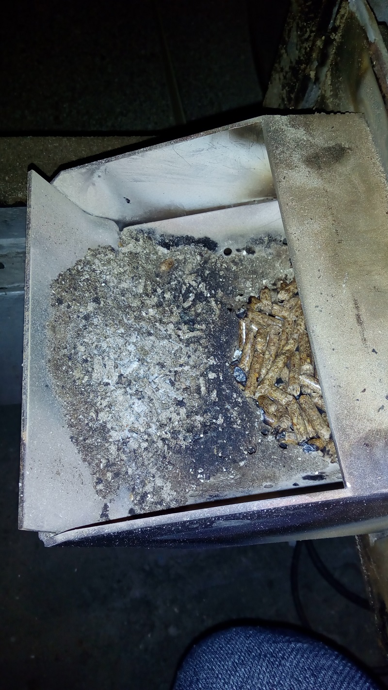 Пепелта ми се вижда по тъмна, отколкото би ми харесало, като цвят. Лееееко недостиг на кислород. Не вярвам подаването да е в повече, на тая мощна горелка, в това топло време. Иначе, не е много, сякаш пелетите са добри.