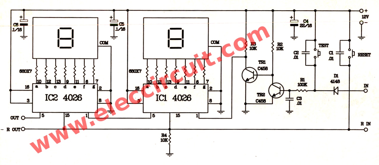 Вижда се че на IC2 от 5-ти крак има изход който трябва да отиде към крак 1 на IC3 (която още я няма на схемата) и така нататък колкото разряда ти трябват.