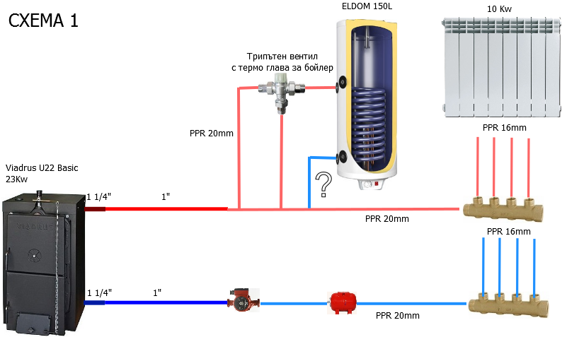 Тази година си купих комбиниран бойлер на Елдоминвест 150л, който искам да присъединя към парното и да използвам като малък буфер, за да разтоваря малко системата и да сваля температурата на водата, която отива към радиаторите като запазя 80 градуса на изхода на котела.