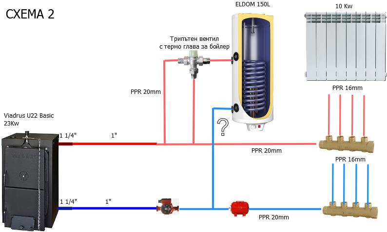 Приложените схеми - 01 и 02 илюстрират това, което имам като идея. За мен схема 01 е по-приемливата, защото при схема 02 след затопляне на бойлера водата ще циркулира през него без да отдава енергия и съществува реален риск да прегрея системата, която така или иначе работи на ръба.