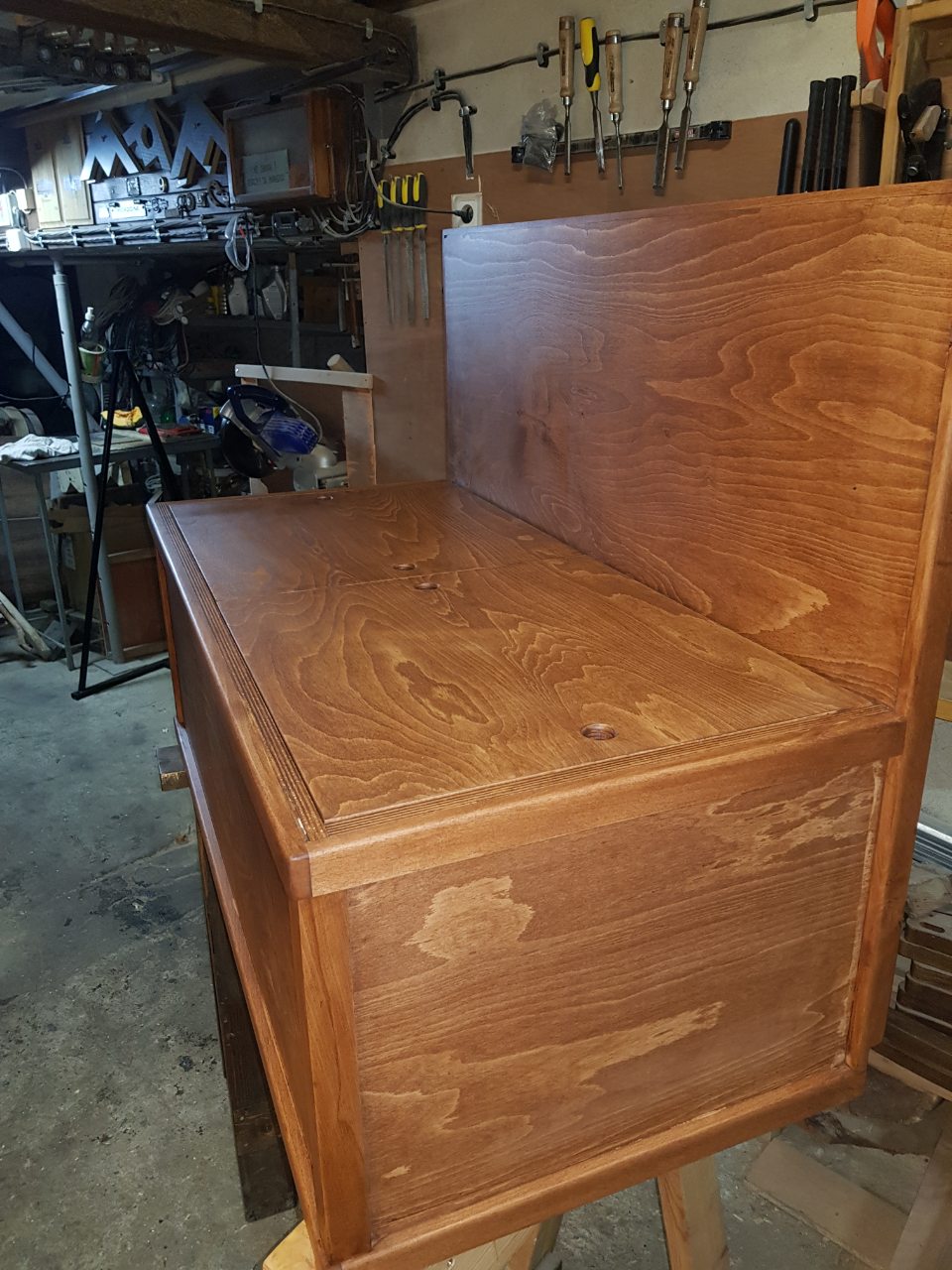 Най-накрая тази година и аз да "извадя" нещо по-голямо от работилницата. Миндер за в кухнята. Изцяло буков. Шлайфан до 400. След това 2 слоя байц натурален от Вальо. След това 2 слоя ленено масло, като пршлайфам с 400 шкурка между нанасянето. И накрая 1 слой вакса натурална за външно импрегниране ( такава имах ) :