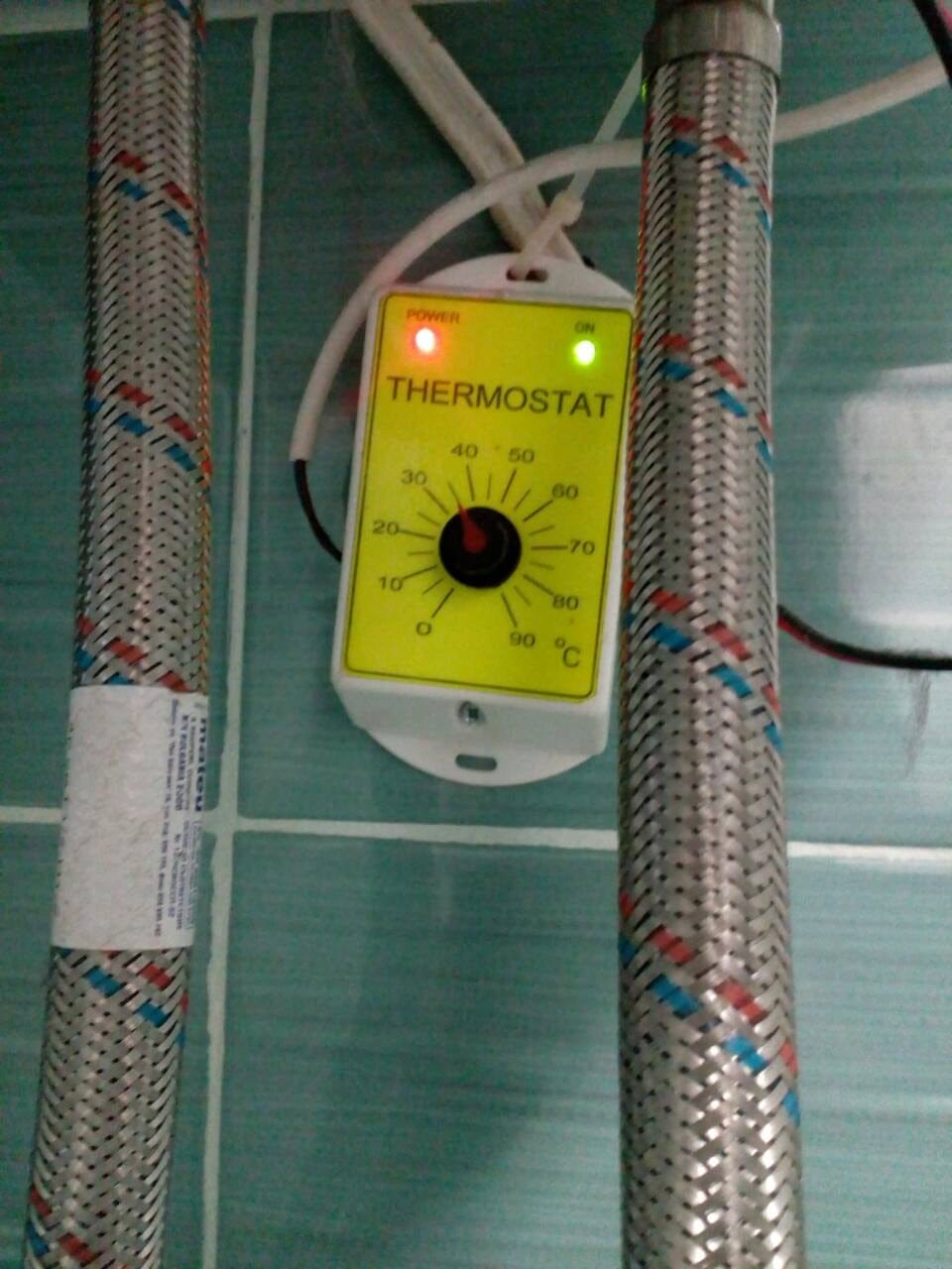 Работи правилно аз просто не съм го вързал както трябва .Но все още не разбирам термостата който е настроен на 35 градуса примерно от къде взема тази температура ТРЯБВА ли да свържа датчик към клемите от лявата страна и да поставя до някоя тръба да взима температура от там..