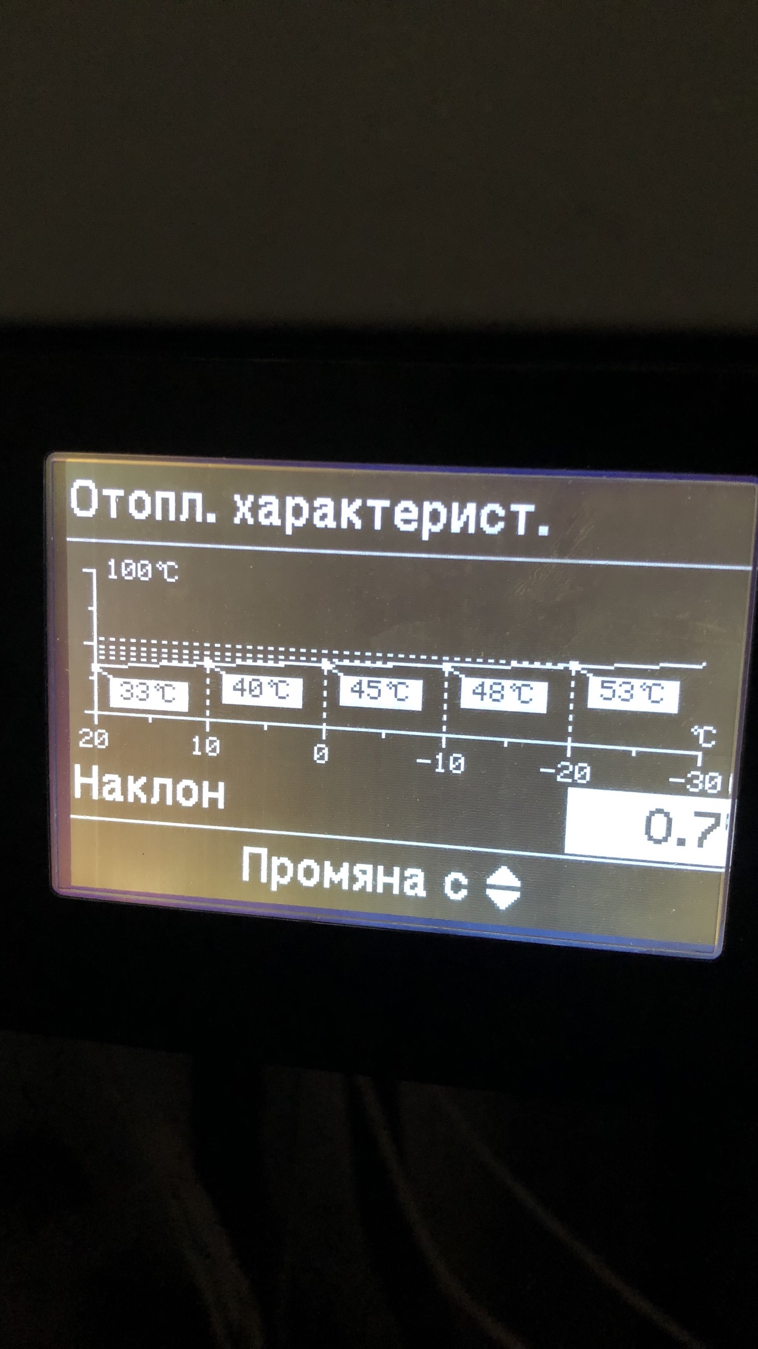 Свали наклона от 0.7 на 0.4 нивото го остави така. Пробвай ден два как е климата в къщата. Ако ти е топло сваляй още нивото ще стане по-икономична помпата, ако ти е студено ще трябва да го качиш.