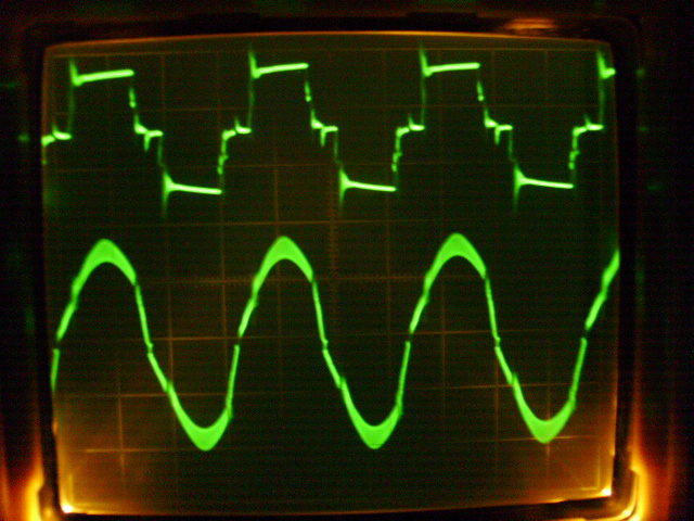 За да не са само приказки ето как изглежда една осцилограма,взета от руски сайт, напрежение на гейта и резонансния кондензатор. Незнам как е измерено ,не ми се рискува да опукам осцилоскопа. :)