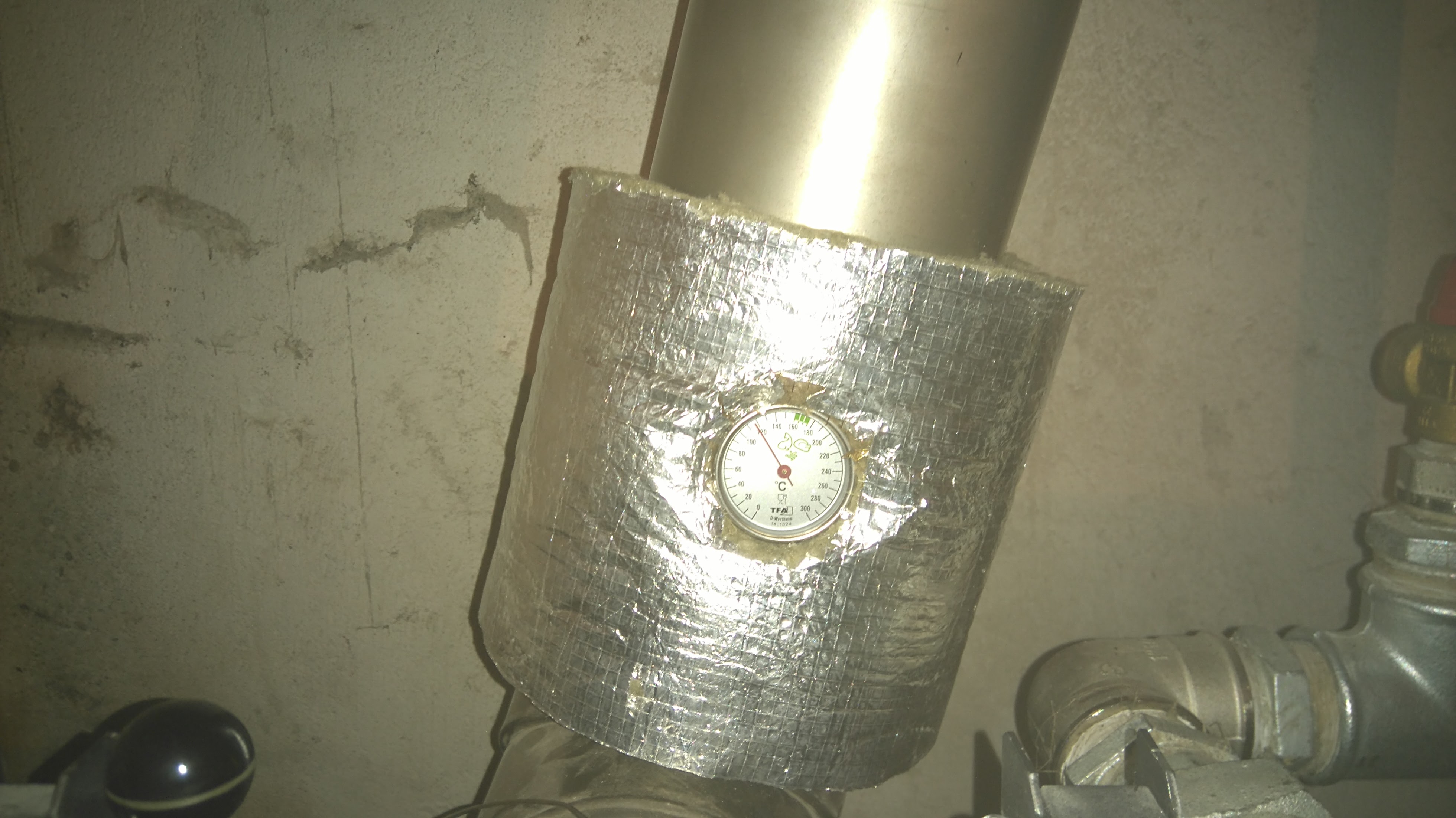 С термометър със сонда дълга 10-15 см -пробива се отвор в димоотвода и се вкарва гилзата .