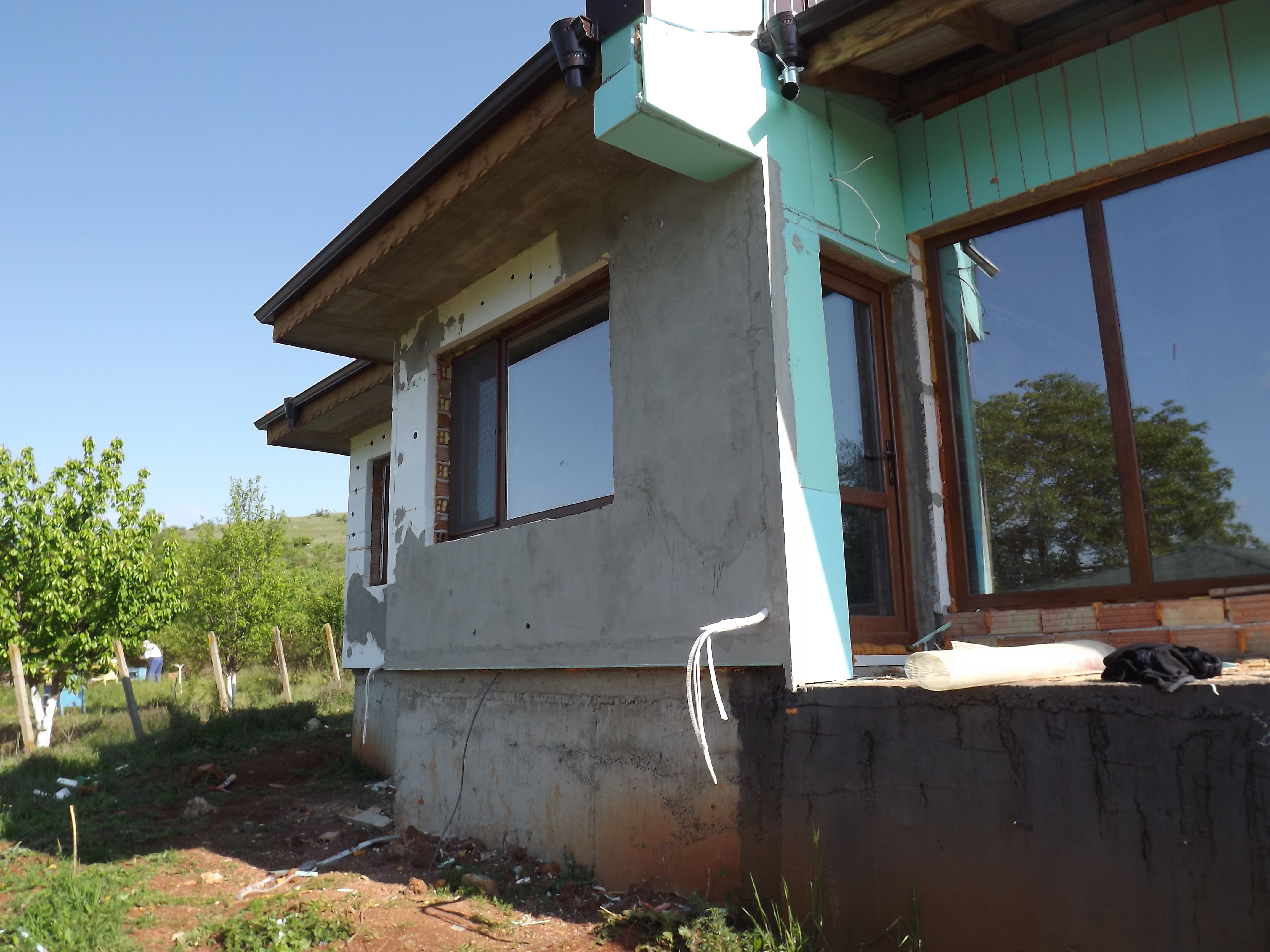 Доставката на изолацията и подовата замазка се случи началото на април 2016-та. През това време прочетох почти всичко тук във форума за полагане на външна изолация и гледах на една-две къщи как работят фирмите. Запитах няколко фирми за цена на изработка с финиш мазилка, цената се въртеше около 8500 лева с финиш Капарол. И реших, че ще я правя сам, като лепя с розовата пяна на Церезит ST84.
