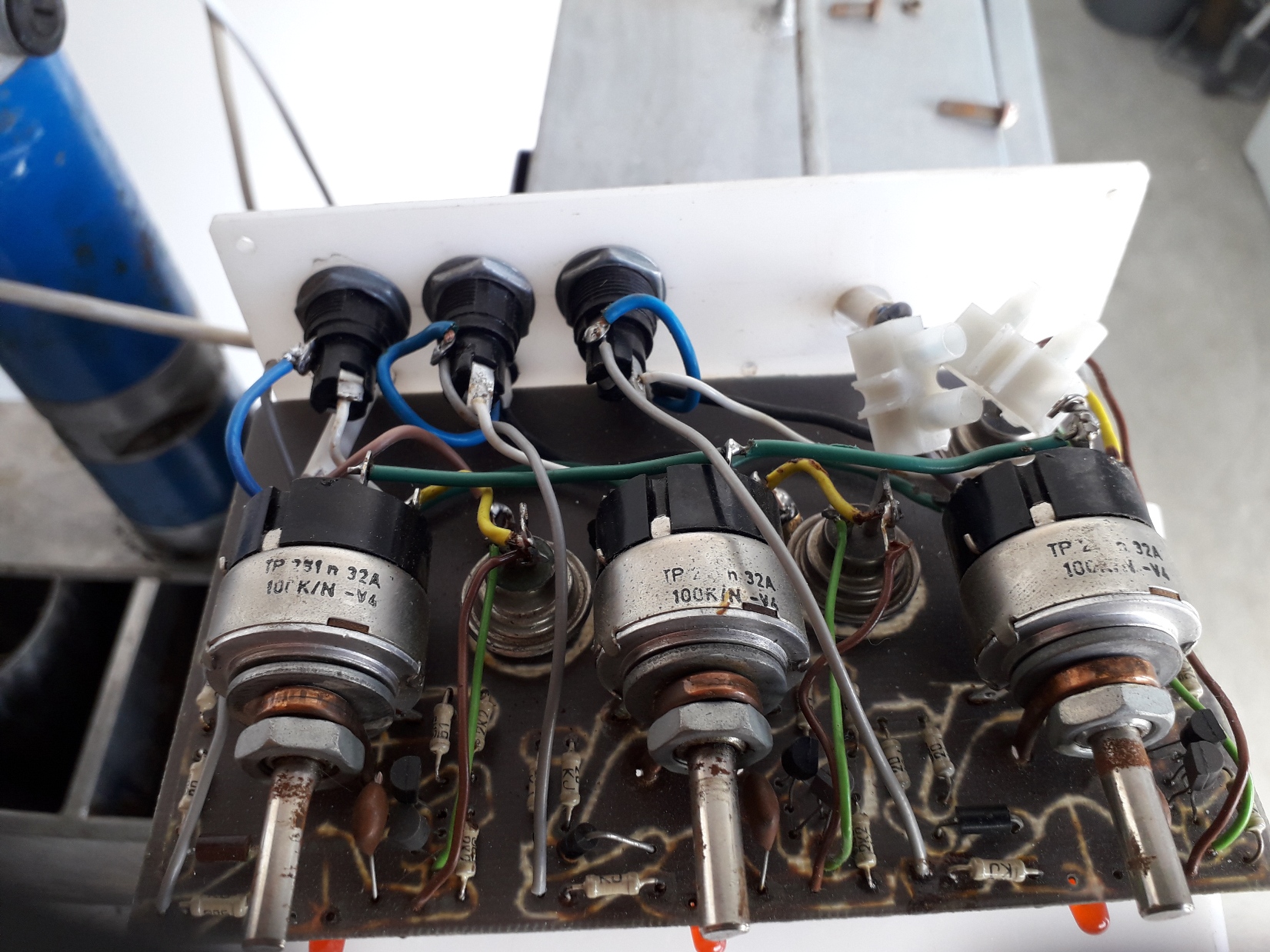 потенциометъра има 4 извода и захранването е на два от тях , на третия извод е тиристора а на четвъртия през бушон към двигателя.всеки потенциометър в крайно ляво положение има ключ за прекъсване на веригата.