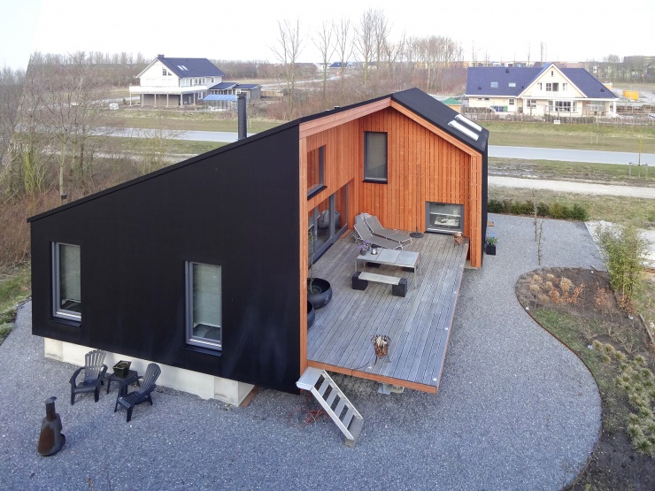 Теренът още не е изравнен, но на око наклонът ще стане максимум 5% (не градуса) според мен, с по 1 подпорна стеничка на улицата и в дъното. Казвам го, защото водоотвеждането, ако не е на покрива, трябва да е на земята...