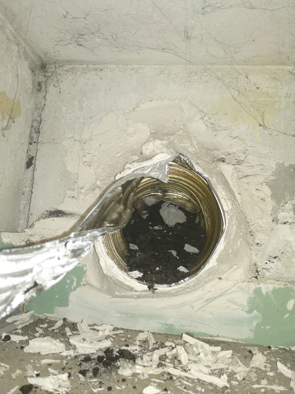 Почистване от паднали бетони и други неща, увеличаване на размера на тръбата, и изхода ѝ от 110 на 150мм. В допълнение, работи освен по-добре, НО и по-тихо от преди. Остава да се преправят малко от дъските на кухнята и да се направят малко поправки, но това вече утре.
