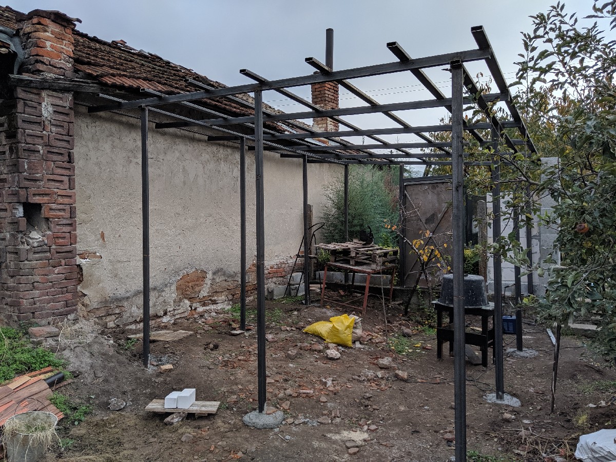 Моля за малко идеи. Правим в задния двор нещо като барака за инструменти и ненужни за момента вещи. Направихме конструкцията от метал, може да се види на прикачените снимки. Сега умувам, с какво да затворя стените и покрива, вариантите за момента са права ламарина, нагъната ламарина, термо панел... Водещи са здравина и цена. Размерите са 5.20м на 3.40м