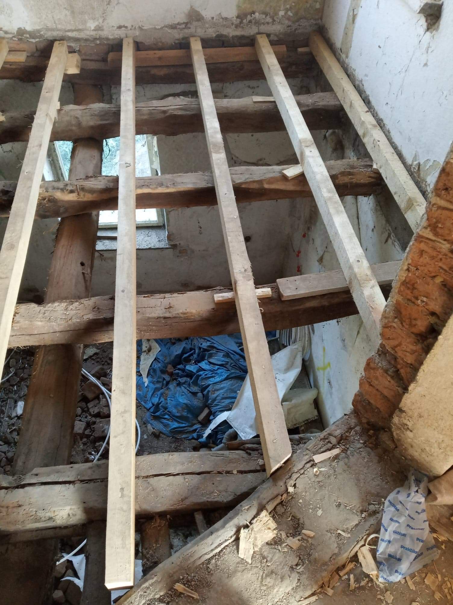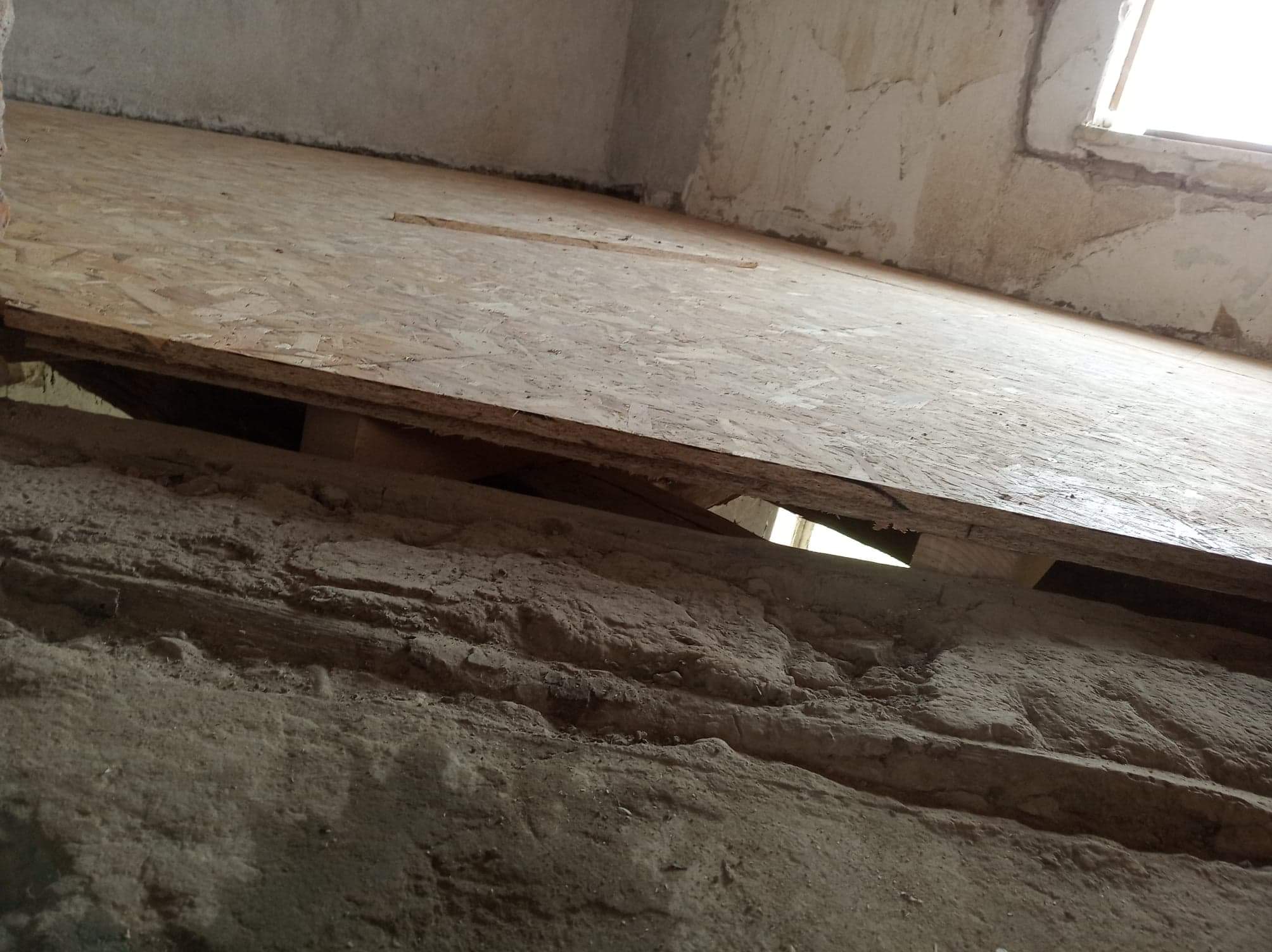 Ремонтът продължава. Вече са сложени греди между двата етажа - в едната стая 10х8, в другата 8х6. Така изравнихме нивата на двете стаи. Гредите са през около 40 см, така че един лист OSB стъпва върху четири греди. Върху гредите наредихме два слоя OSB с дебелина 15 мм. Стана стабилно. Голяма играчка беше нивелирането, понеже старите носещи греди бяха доста криви - на места подлагахме доста, на места зарязвахме.