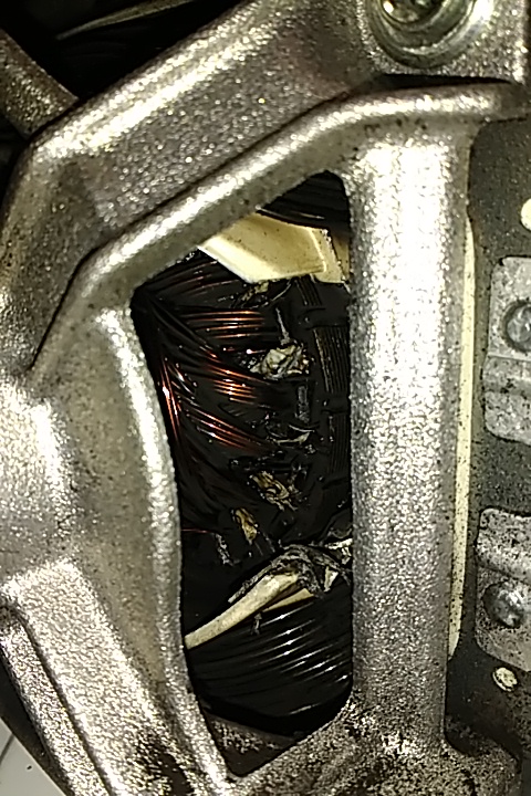 Снимка 2 - на мотора отгоре - червената стрелка показва черни кабели, бялата пластмасов елемент (който е възможно да е разтопен навътре, но не се вижда), а жълтата стрелка показва червена намотка тип тел, в жълто съм оградила място, върху което изглежда, че е капало нещо горещо и е засъхнало между намотките.