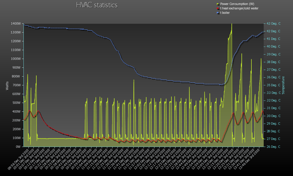 2v6 написа:Термопомпа понякога "яде" от топлината на бойлера, понякога добавя топлина. разгледай внимателно ЕКГ-то дето съм сглобил. тоест и без да ползвам болера, температурата в него играе нагоре надолу. а ако навън стане по-топло, направо почва да си тегли от бойлера цялата топлинка..naughty написа:точно това имам в предвид, моя бойлер е фреонов. няма как да се отговори на въпроса "колко топлина е произвела термопомпата"Ти имаш 2 в 1 - един компресор грее два топлообменника фреон-вода. Измерването на получената топлина може да стане с два топломера - един за отоплението и втори за бойлера
