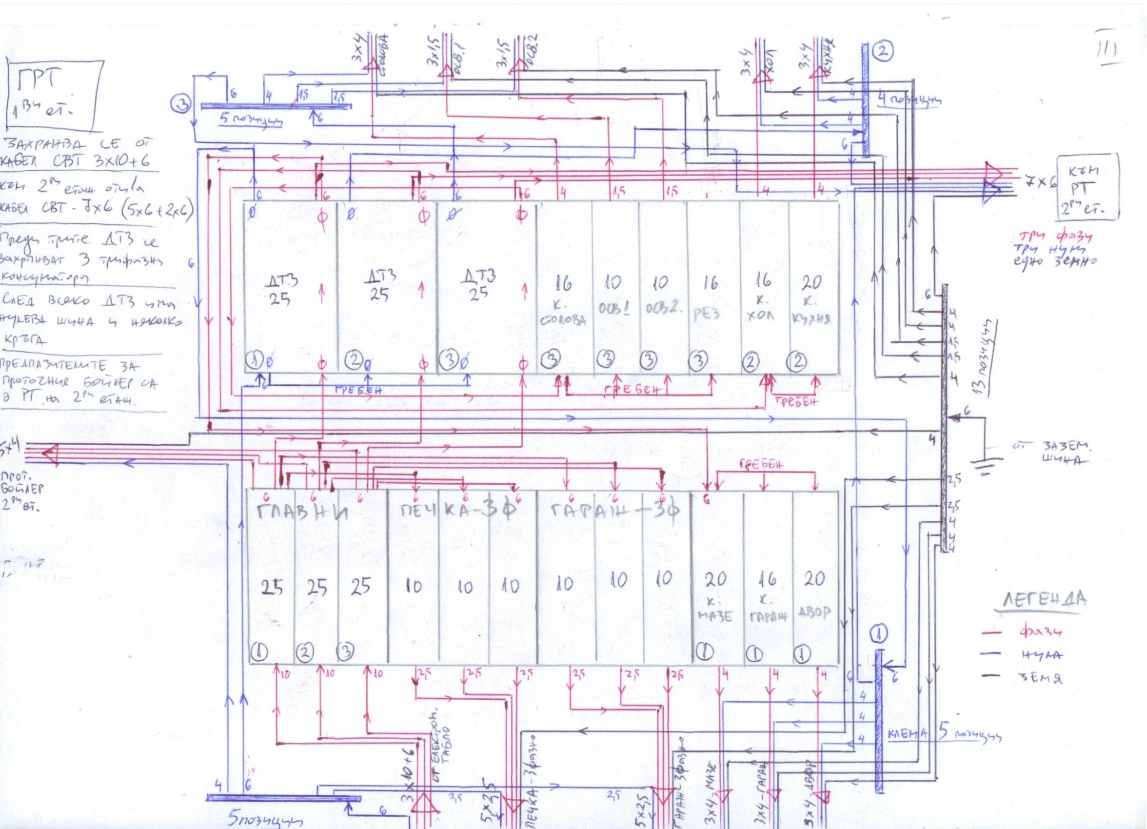 С ваша помощ стигнах до следната схема - Три главни АП по 25А, след тях трифазно захранване на печка, проточен бойлер (засега само ще положа кабелите, на следващ етап ще мисля дали да слагам бойлер), трифазен контакт в гаража. След това минавам на три монофази с по една обща ДТЗ 25 А за всяка. След тях отделните кръгове, като съм гледал да разпределя мощностите, така че трите фази да са равномерно натоварени. Смятам да защитя готварската печка и проточния бойлер с индивидуални трифазни ДТЗ преди самите уреди, така че не съм ги давал на схемата, понеже няма да са част от разпределителните табла (в тях и без това няма повече място). Трифазния контакт в гаража засега не смятам да защитавам с ДТЗ.