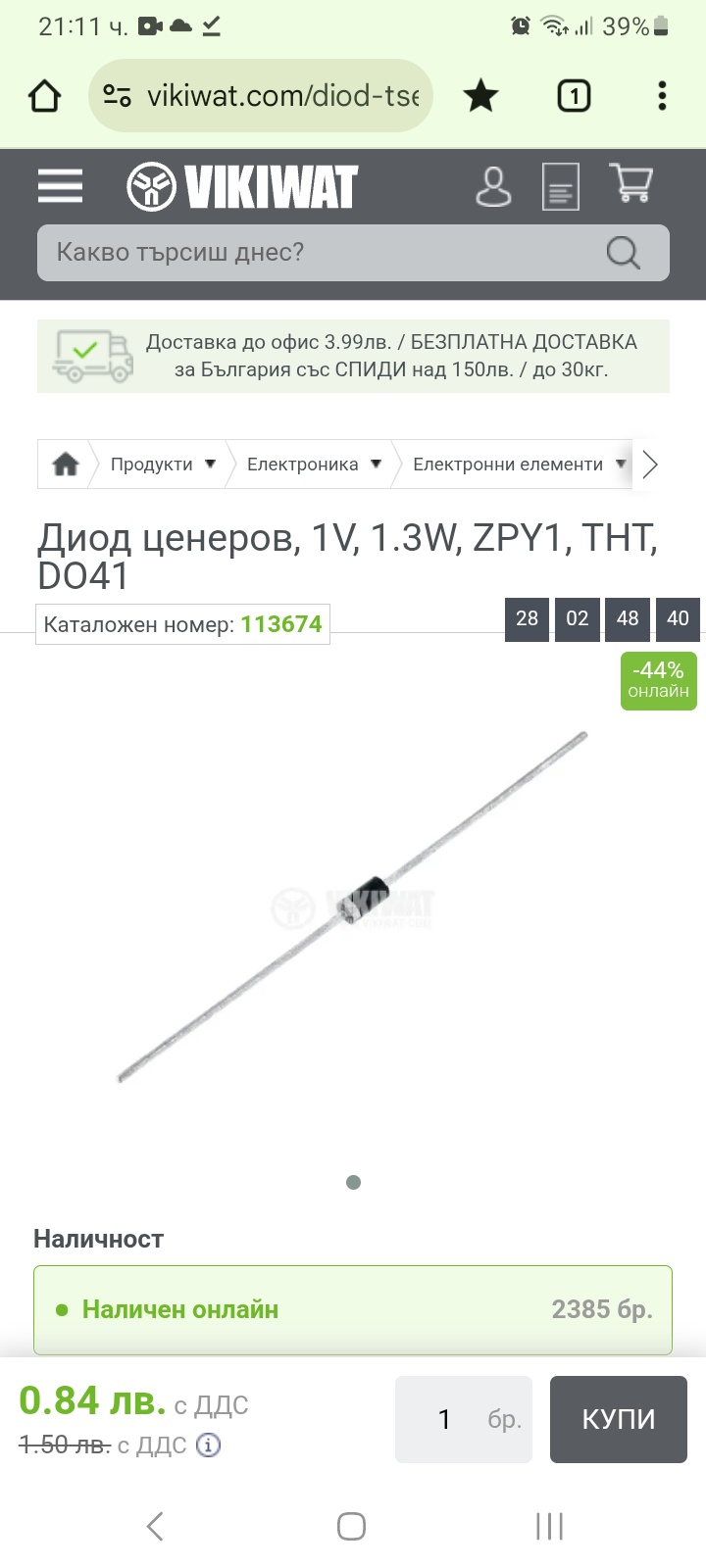Хюстън" имат температурен коефициент на напрежението от -0.250%/℃. Ценеровите диоди могат да се разделят условно на две групи с изключения. Тези с напрежение на стабилизация над 5,6V имат положителен температурен коефициент. Аналогично тези с напрежение на стабилизация под 5,6V имат отрицателен температурен коефициент. Значи от тях ни трябва ! И какво да изберем - отваряме един справочник от 1990 година и търсим подходящ с възможно най-ниска стойност. КС133А е сред рекордьорите, но само с -0,11 %/⁰C. Наполовина от това което ни трябва. Победител в "надпреварата" е SZX18/1(SZX18-1). Той е с -0,26 %/⁰C. Той е за напрежение 0,65-0,85V. Дефакто трябва да се внимава много при свързването, защото в едната посока е прост диод а в другата е ценер и то на едно и също напрежение. Към момента съм го открил само в един магазин и то в Турция