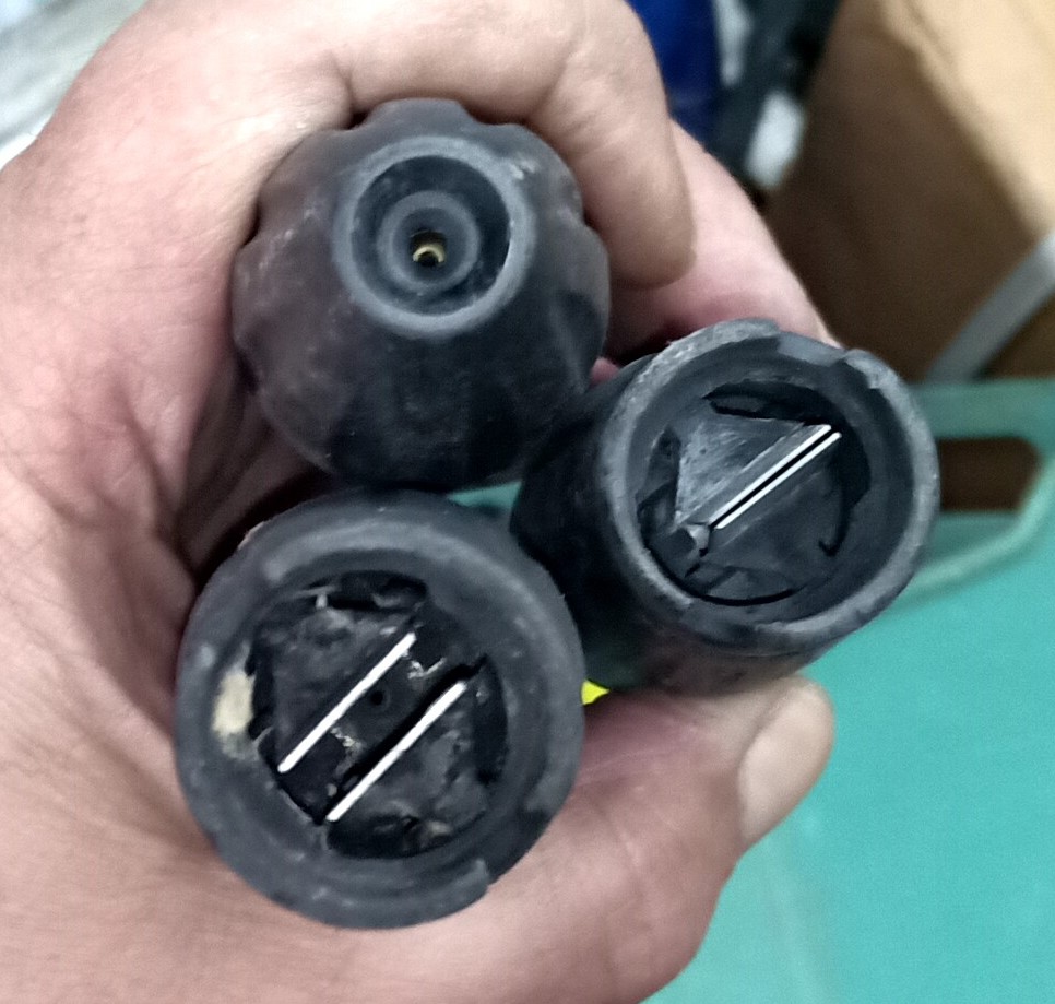 Ето ти и основната дюза в цял вид дето ти обяснявам че е като тръбичка. На завихрящата дюза /зелената пластмаска/ както виждаш почти няма следи от износване къде е контактувала съчмата въпреки че в нормално състояние те се допират много лекичко. Това е така защото като се вдигне налягането и водата я избутва на пред и я уплътнява към отвора от пред на външния корпус.