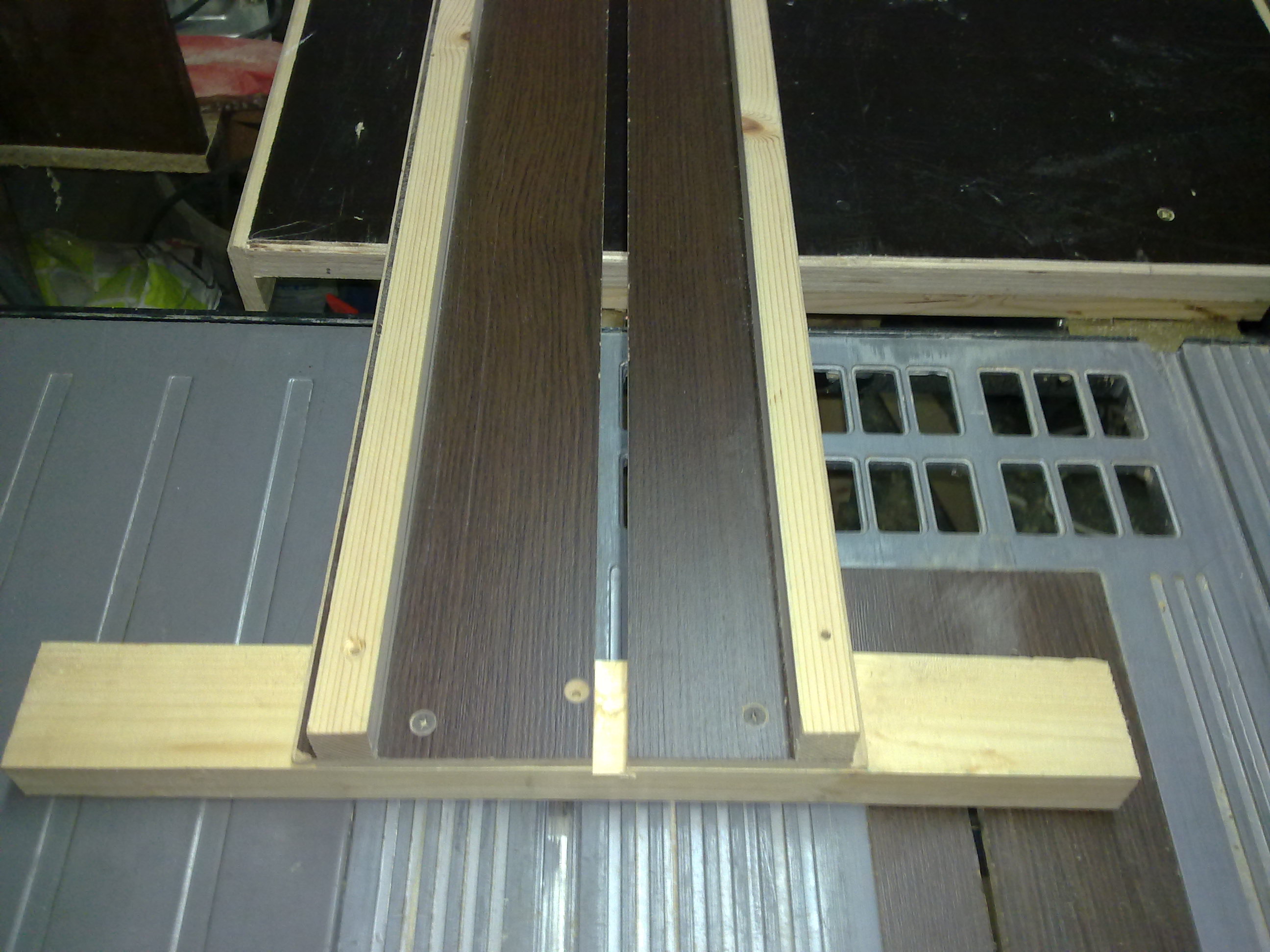 Зедикус и Еди са големи фрезисти и са вдигнали доста летвата по тая тема, затова сигурно това приспособление ще ви се стори елементарно, но реших да ви го покажа. Пролетта правих един шкаф и исках рафтчетата да са стуктурни (да са вградени в страниците) и ми трябваше нещо, с което да издълбая каналите. Направих водача, който виждате по-долу, за 20 минути. Това му е едно от предимствата - става бързо и каналът показва точно къде режеш (няма нужда да смяташ отстояния от водач до център на фрезера и да вадиш радиуси). Недостатък му е, че работи само с една фреза и един фрезер. Подложката е от ламинат - тоя материал е идеален за всичко друго, само не и да си го сложиш на пода (според мен, де). Водачите отстрани и отдолу са чамови летвички от кофата за подпалки.