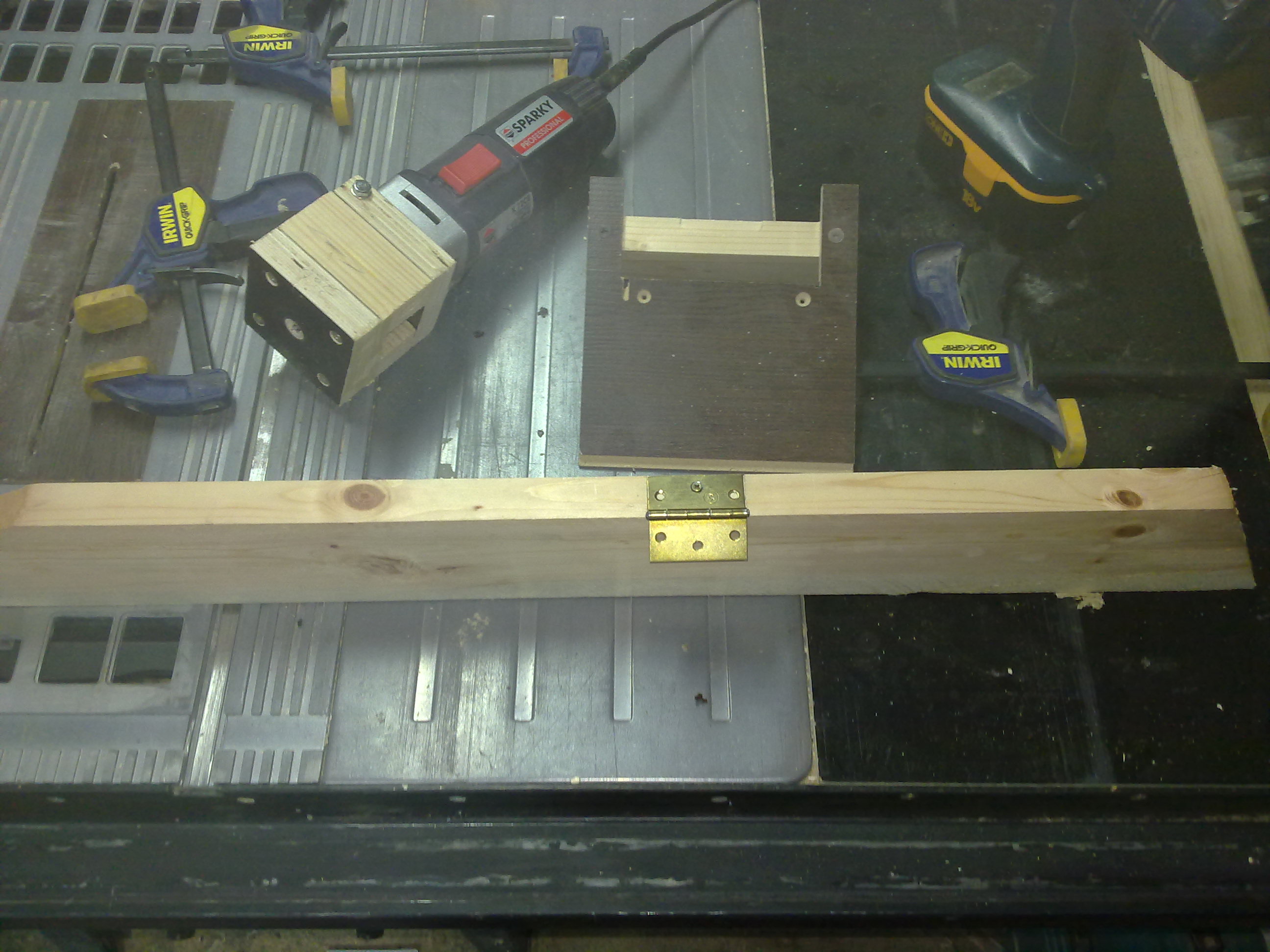 Вчера споменах за пантичките нещо и се сетих, че имам още едно приспособление за оберфреза (тя и самата фреза е бая приспособена). Вместо да вкопавам пантите с длето, направих ето това долу, за да спестя малко време. Направено е само за конкретния размер панти, но пък не отнема време да се преправи.