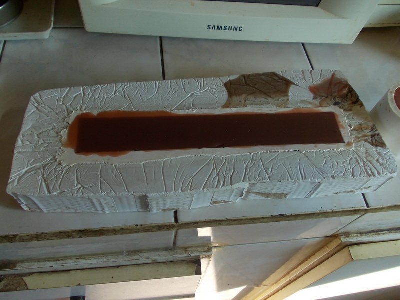 Обикновен строителен гипс смесен с гипсова мазилка на KNAUF в съотношение 1:1. В гипсовата мазилка има ситен кварцов пясък и забавител на застиването - удължава времето за работа със сместа. Може да се добави и до 20 % стрит перлит като пълнител и термоизолатор. Сместа се прави относително редичка (гъста боза) за да може да се налива върху модела. Ако ви се стори все пак бързо застиването на сместа може да добавите 2 - 3 капки на литър смес ръждопреобразувател (разредена ортофосфорна киселина). Покрива се с налон за да се изпарява бавно водата поне за 4 - 5 часа. След това се отваря и се оставя минимум за 10 часа да съхне при нормална стайна температура. При заливането на модела - най-напред се прави тънък слой от порядъка на 3 - 6 мм. Преди да е застинал напълно гипса се слагат парчета ситна метална мрежичка (комарна или малко по-едра) като арматура, която не позволява напукването на формата при следващите обработки и отливането, след което се залива със слой гипс с дебелина минимум 4 - 5 см.
