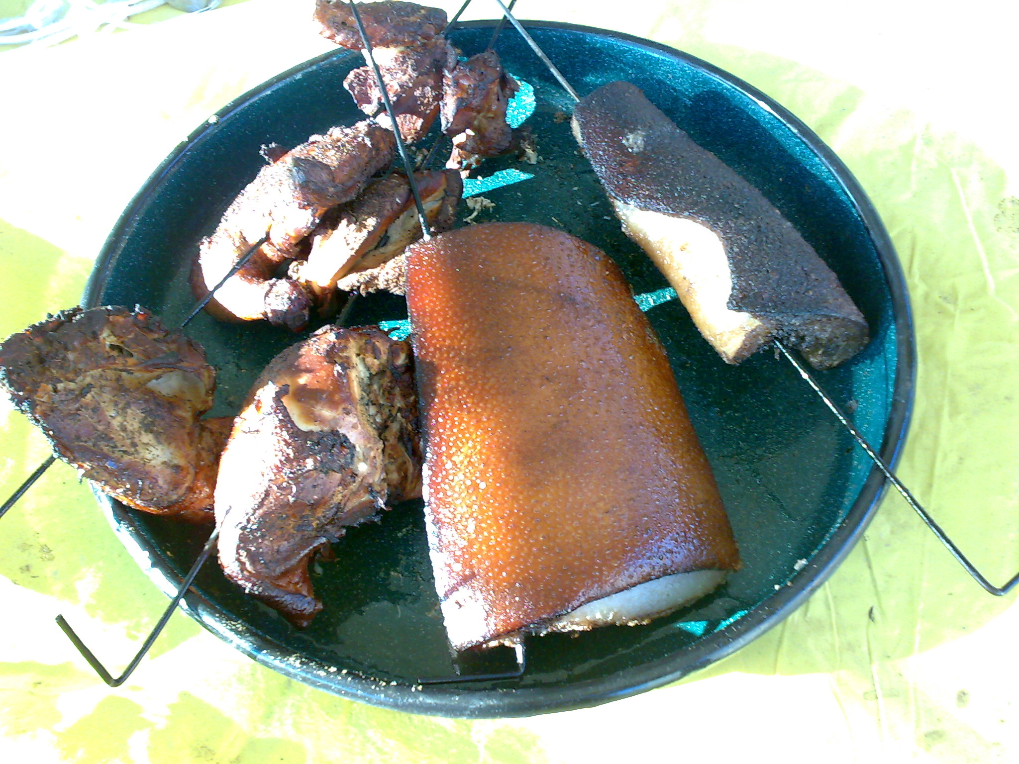Няма тайни :) , сланината я извадих от тенекията, изплакнах я с вода, подсуших и.. на шиша. За пилето съм го обяснил в горните постове. Даже си мисля, че преди опушването трябва да се свари още малко. Колегата го вари 10 мин. в тенджера под налягане, аз го варих 20 мин. в обикновена тенджера. Получи се малко жилаво, но пък за сметка на това много вкусно. Следващия път ще увелича времето на 30-40 мин. и ще шпиковам със сланинка за да стане по- блажно :)