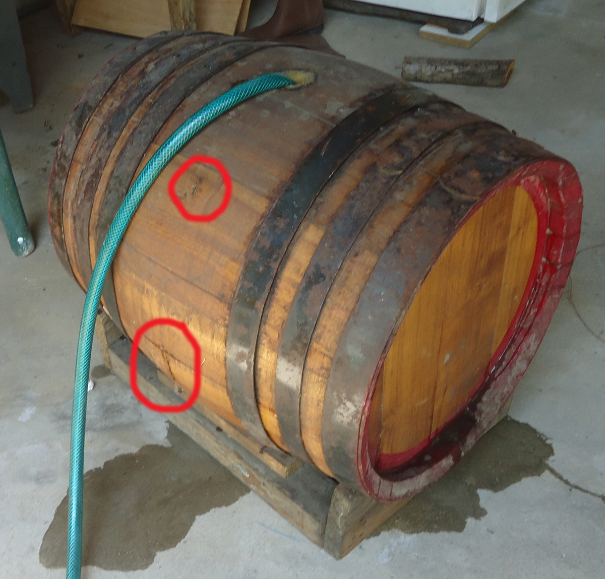 Бъчонката е спукана на две места напречно и според мен нямя как да се запечати от накисването, белязал съм ги на снимката.