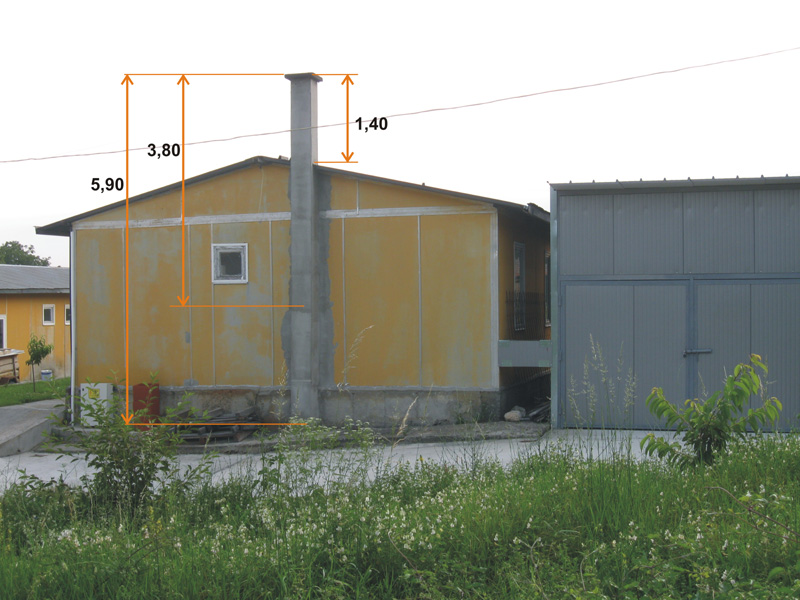 Комшията ми има дърводелска фирма и отскоро си направи сушилня за дървения материал, който използува. В производствената му сграда е печката, а в сушилнята отиват тръби с гореща вода, затоплена в печката. За гориво се използува дървен отпадък и нищо друго. Проблемът е, че димът от комина пада надолу, а не се издига нависоко и вятърът го отнася ту към моя двор, ту към неговите помещения. През зимата - както и да е, но през лятото да мирише на дим, прозорците на къщата са отворени, пък и ние по цял ден сме навън, деца играят по двора... неприятно е. И аз и той сме потърпевши, търси се някакво решение. Коминът е изграден от керамични (?) коминни тела с отвор ф25 см, размерите са посочени на снимката по-долу. От изхода на печката до върха е 3,80 м. а общата височина е 5,90 м. Моля за мнения, само изграждане на висок комин ли е решението или има и друг наичин?
