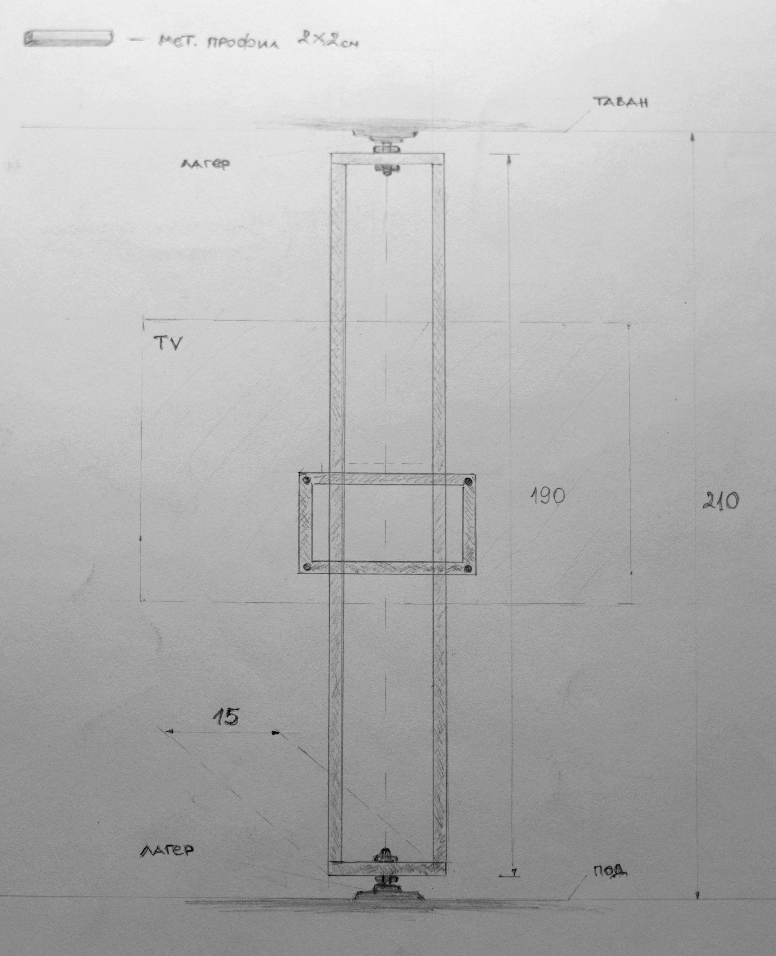 Това, което ме притеснява е общата тежест на изделието (нямам идея колко ще тежи цялата конструкция) + 20 кг. телевизор, а и евентуално на по-късен етап, тонколони. Прилагам проста схема на това (уж) минималистично изпълнение. Не ме съдете много, наясно съм, че никак не ме бива в чертането. :)