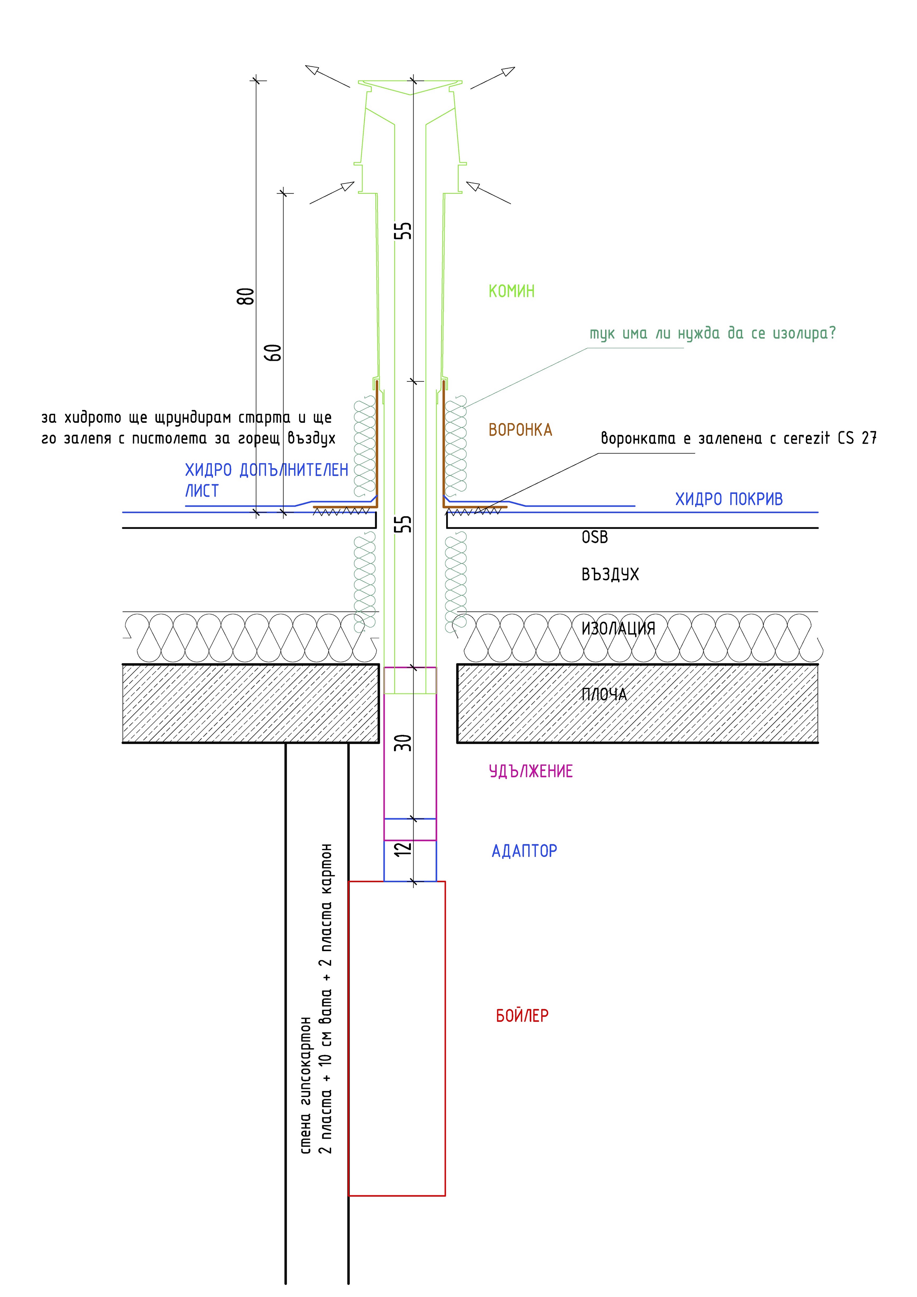 ситуацията - газов бойлер на природен газ в банята и комина ще го монтирам нагоре, плочата е пробита, топлозиолацията е пробита, след това следва OSB и битумна и те са пробити. На битумната отгоре съм залепил една "воронка" но наобратно - и отгоре един лист хидро към 70 на 70 см.