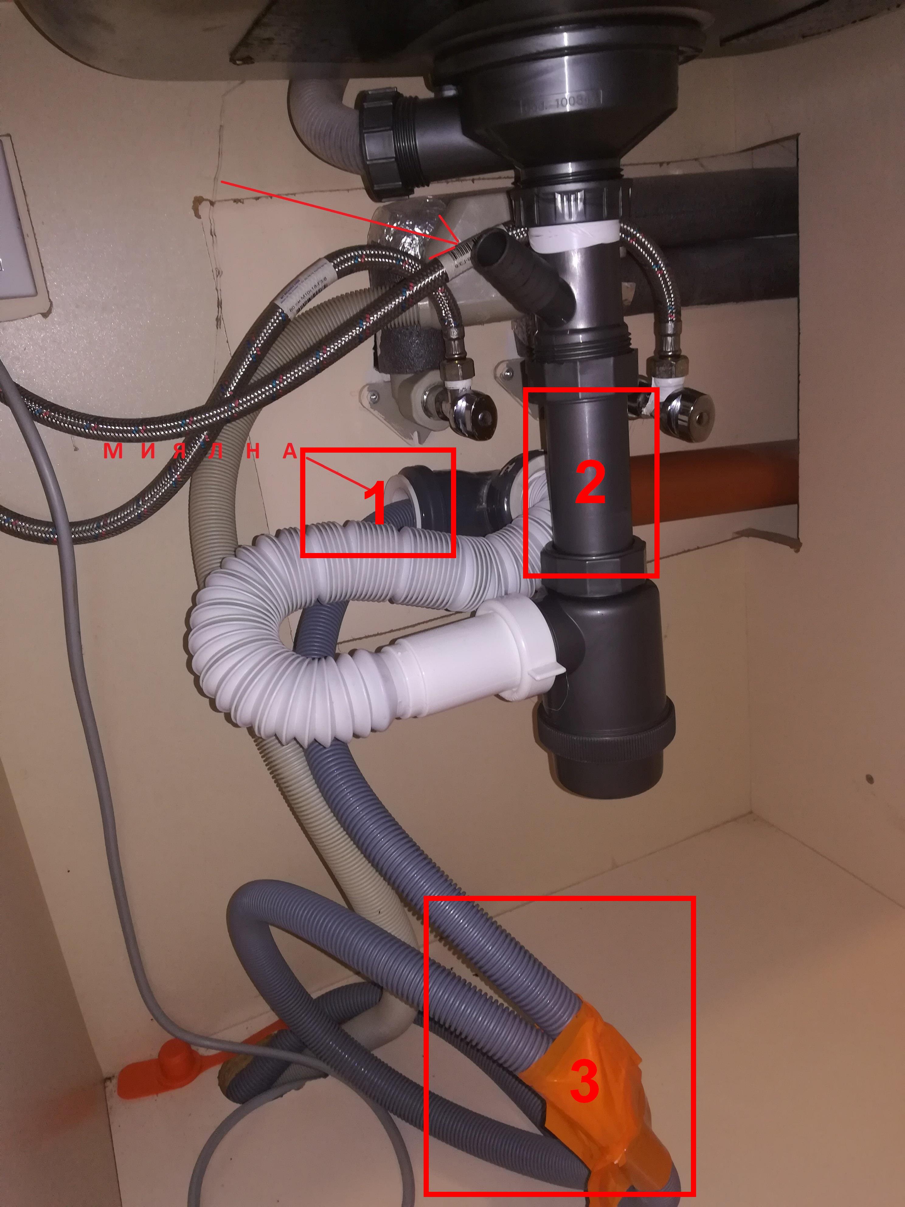Пробвах също да свържа маркуча за отходната вода на миялната към малкото У под сифона (посочил съм го с червена стрелка) и го пристегнах със скоба. Обаче отново има теч когато миялната изхвърля мръсната вода. Освен това ми се иска да ползвам разклонението, което е предвидено в инсталацията от канализационната тръба.