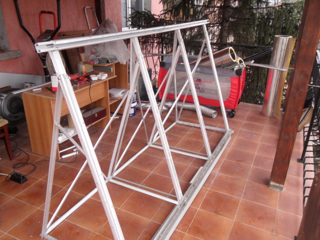 днес с подръчни профили от двора, бараката и гаража, като разглобих 5 вертикални щори и им използвах алуминиевите водачи и с алуминиви винкелчета от които разполагам с големи количества сътворих още една стойка с дължина 2.4м ( целта ми е двете шалета по 1.2м всяко да се използват без фира) Може би ще побере 25-26 тръби по 1800мм