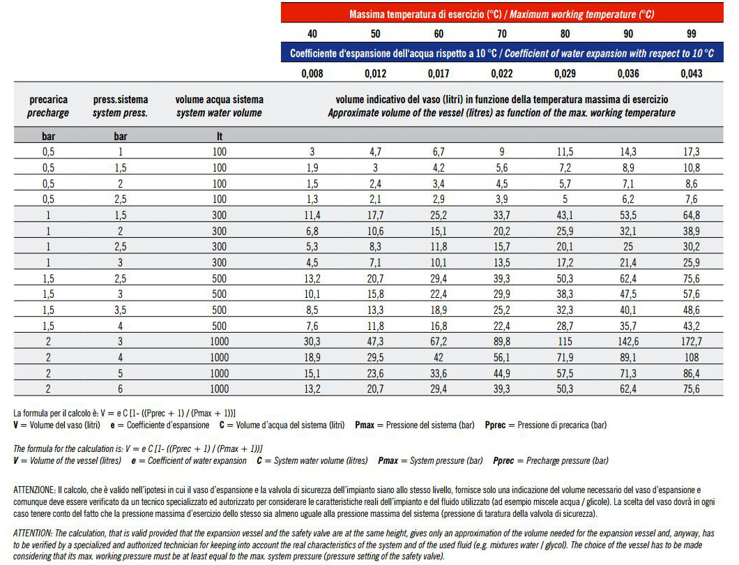 Разширителен съд.jpg Таблица със стойности на водопоемането от разширителни съдове на Zilmet при различните стойности на температурата, предварителното напомпване и системното налягане