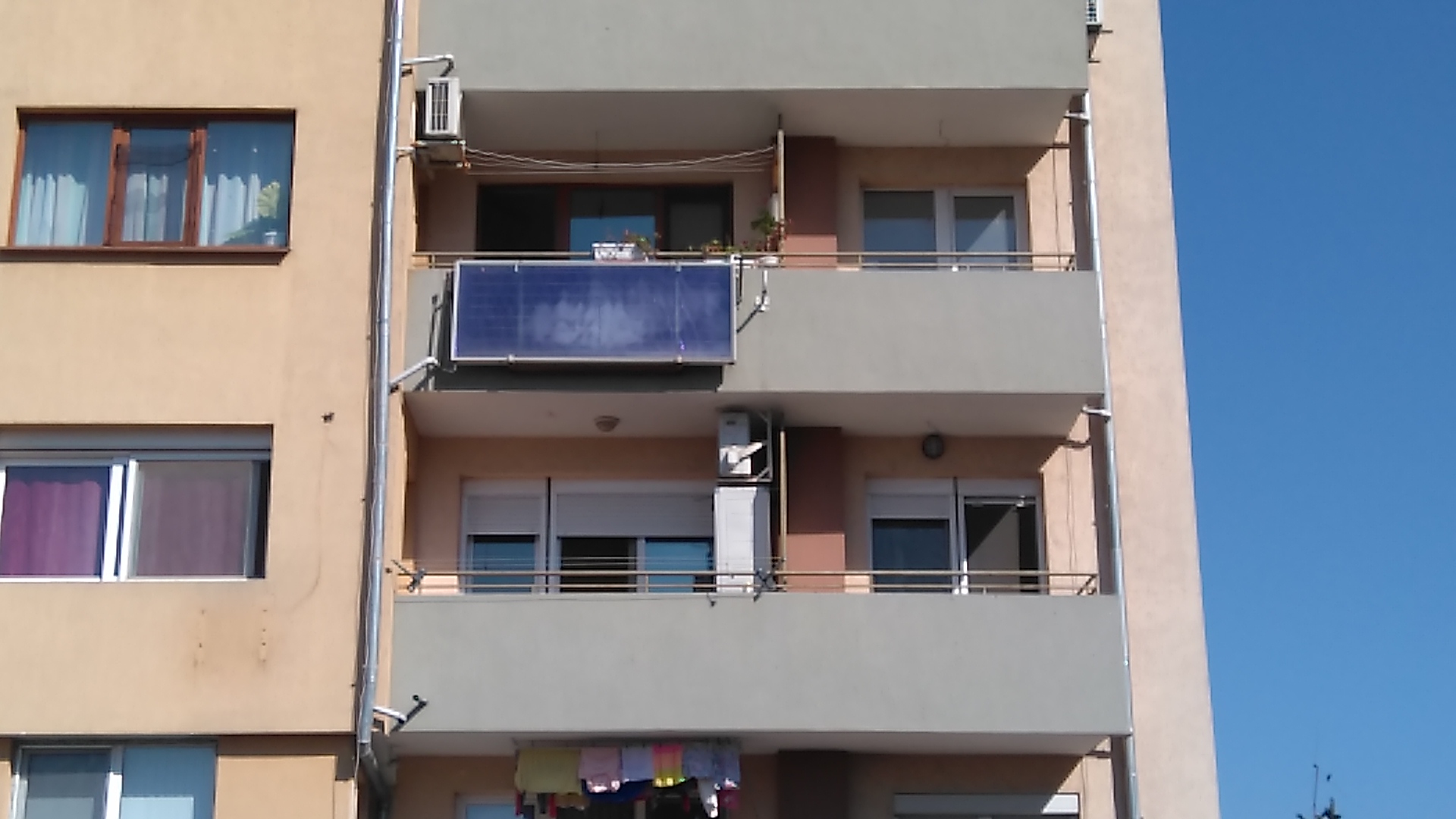 От 10-12 години съм със слънчев слънчев колектор на козирката на терасата (живея в панелка на последния седми етаж). Хоризонтално вместо вертикално.