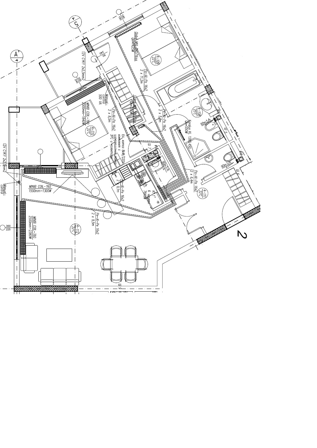 До колкото виждам в проектът, най-дългото трасе е 11,2 м, но за другите детайли не съм компетентен. Прикачвам го и ако някой може, нека каже предположенията му, дали ще мога да се отоплявам с термопомпа и тръби ф16.