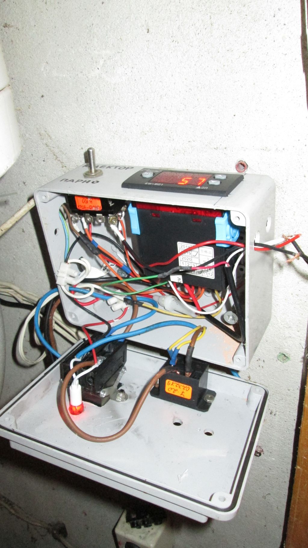 И така. Успях да събера в кутията ключа на бойлера и 30А реле, което замени стария бръмчащ контактор.
